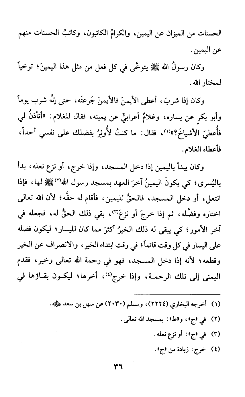 وكان يبدأ باليمين إذا دخل المسجد، وإذا خرج، أو نزع نعله، بدأ باليسرى؛ كي يكون اليمين آخر العهد بمسجد رسول الله صلى الله عليه وسلم لها، فإذا انتعل، أو دخل المسجد، فالحق لليمين، فأقام له حقه؛ لأن الله تعالى اختاره وفضله، ثم إذا خرج أو نزع، بقي ذلك الحق له، فجعله في آخر الأمور؛ كي يبقى له ذلك الخير أكثر مما كان لليسار؛ ليكون فضله على اليسار في كل وقت قائماً؛ في وقت ابتداء الخير، والانصراف عن الخير وقطعه؛ لأنه إذا دخل المسجد، فهو في رحمة الله تعالى وخير، فقدم اليمنى إلى تلك الرحمة، وإذا خرج، أخرها؛ ليكون بقاؤها في