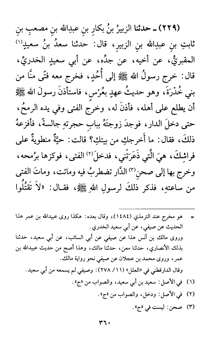 229 - حدثنا الزبير بن بكار بن عبد الله بن مصعب بن ثابت بن عبد الله بن الزبير، قال: حدثنا سعد بن سعيدٍ المقبري، عن أخيه، عن جده، عن أبي سعيدٍ الخدري، قال: خرج رسول الله صلى الله عليه وسلم إلى أحدٍ، فخرج معه فتىً منا من بني خدرة، وهو حديث عهدٍ بعرسٍ، فاستأذن رسول الله صلى الله عليه وسلم أن يطلع على أهله، فأذن له، وخرج الفتى وفي يده الرمح، حتى دخل الدار، فوجد زوجته بباب حجرته جالسةً، فأفزعه ذلك، فقال: ما أخرجك من بيتك؟ قالت: حيةٌ منطويةٌ على فراشك، هي التي ذعرتني، فدخل الفتى، فوكزها برمحه، وخرج بها إلى صحن الدار تضطرب فيه وماتت، ومات الفتى من ساعته، فذكر ذلك لرسول الله صلى الله عليه وسلم، فقال: ((لا تقتلوا