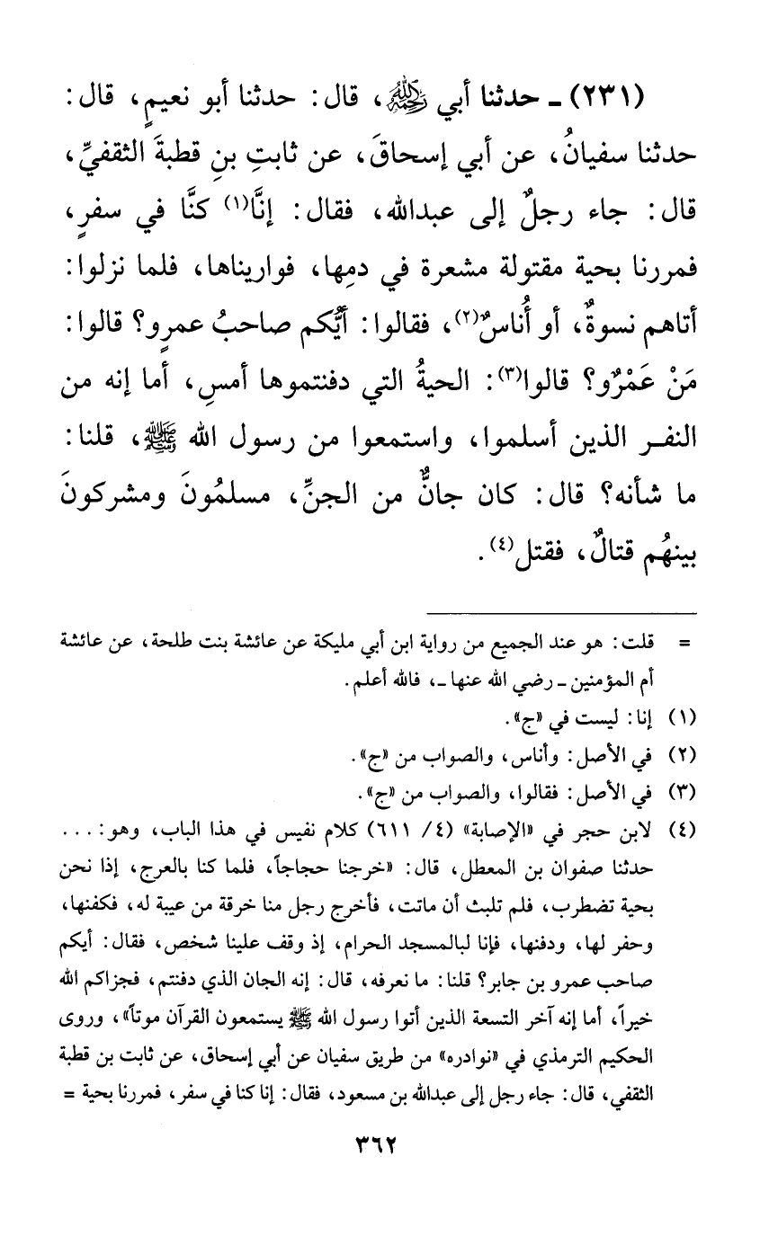 231 - حدثنا أبي رحمه الله، قال: حدثنا أبو نعيمٍ، قال: حدثنا سفيان، عن أبي إسحاق، عن ثابت بن قطبة الثقفي، قال: جاء رجلٌ إلى عبد الله، فقال: إنا كنا في سفرٍ، فمررنا بحية مقتولة مشعرة في دمها، فواريناها، فلما نزلوا: أتاهم نسوةٌ، أو أناسٌ، فقالوا: أيكم صاحب عمرٍو؟ قالوا: من عمرٌو؟ قالوا: الحية التي دفنتموها أمس، أما إنه من النفر الذين أسلموا، واستمعوا من رسول الله صلى الله عليه وسلم، قلنا: ما شأنه؟ قال: كان جانٌّ من الجن، مسلمون ومشركون بينهم قتالٌ، فقتل.