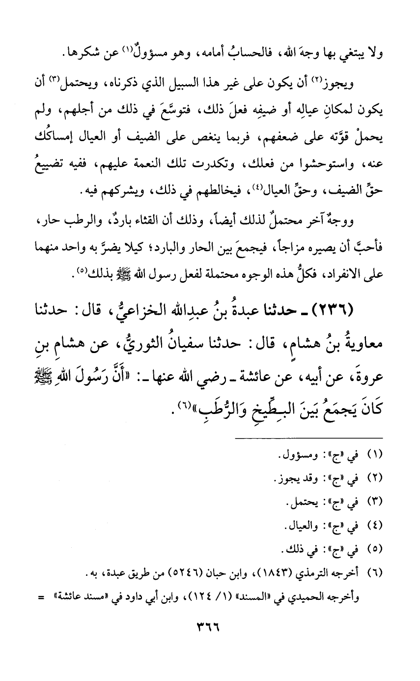 236 - حدثنا عبدة بن عبد الله الخزاعي، قال: حدثنا معاوية بن هشامٍ، قال: حدثنا سفيان الثوري، عن هشام بن عروة، عن أبيه، عن عائشة -رضي الله عنها-: ((أن رسول الله صلى الله عليه وسلم كان يجمع بين البطيخ والرطب)).