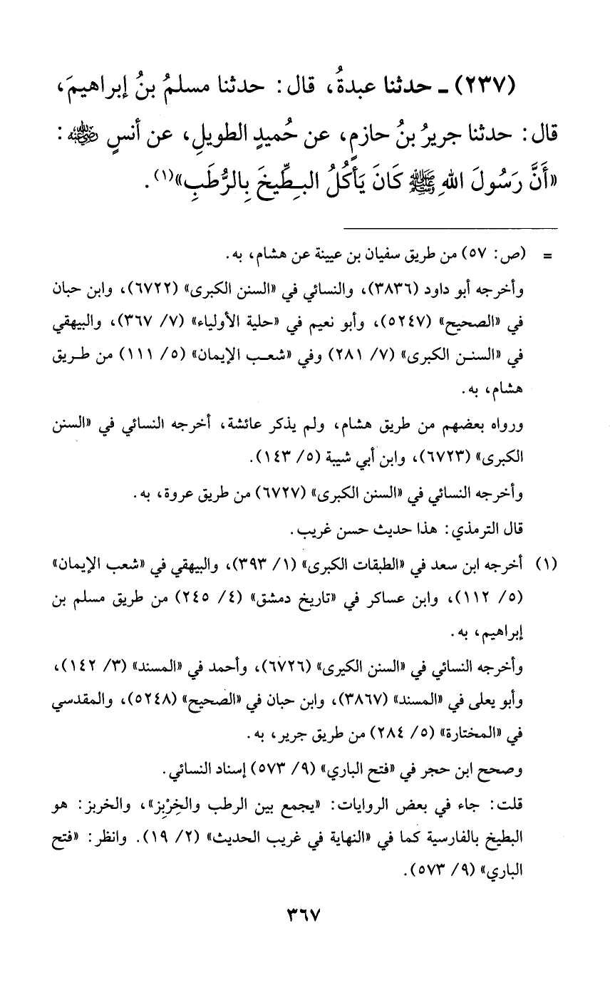 237 - حدثنا عبدة، قال: حدثنا مسلم بن إبراهيم، قال: حدثنا جرير بن حازمٍ، عن حميدٍ الطويل، عن أنسٍ رضي الله عنه: ((أن رسول الله صلى الله عليه وسلم كان يأكل البطيخ بالرطب)).