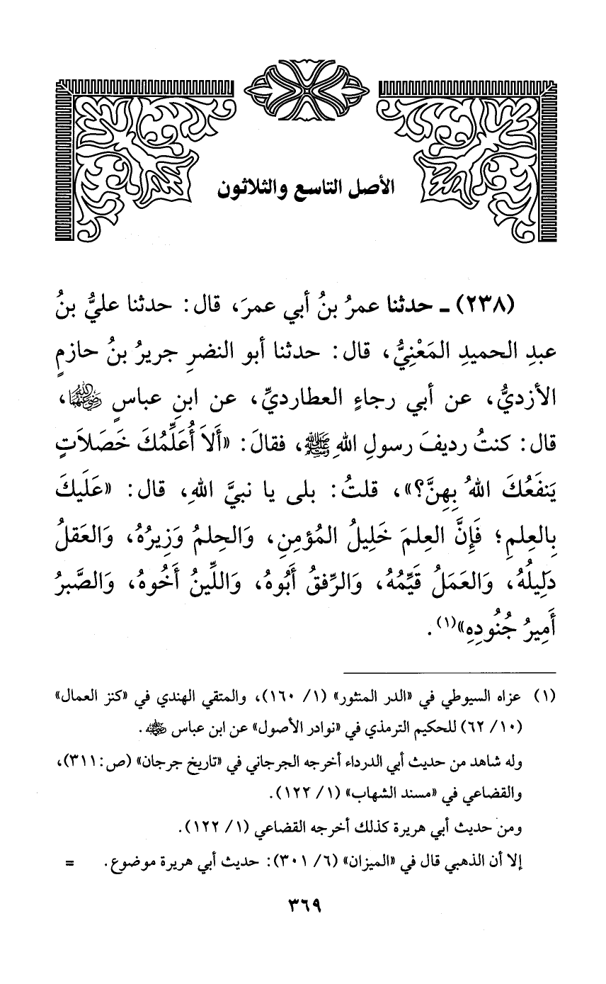 238 - حدثنا عمر بن أبي عمر، قال: حدثنا علي بن عبد الحميد المعني، قال: حدثنا أبو النضر جرير بن حازمٍ الأزدي، عن أبي رجاءٍ العطاردي، عن ابن عباسٍ رضي الله عنهما، قال: كنت رديف رسول الله صلى الله عليه وسلم، فقال: ((ألا أعلمك خصلاتٍ ينفعك الله بهن؟))، قلت: بلى يا نبي الله، قال: ((عليك بالعلم؛ فإن العلم خليل المؤمن، والحلم وزيره، والعقل دليله، والعمل قيمه، والرفق أبوه، واللين أخوه، والصبر أمير جنوده)).