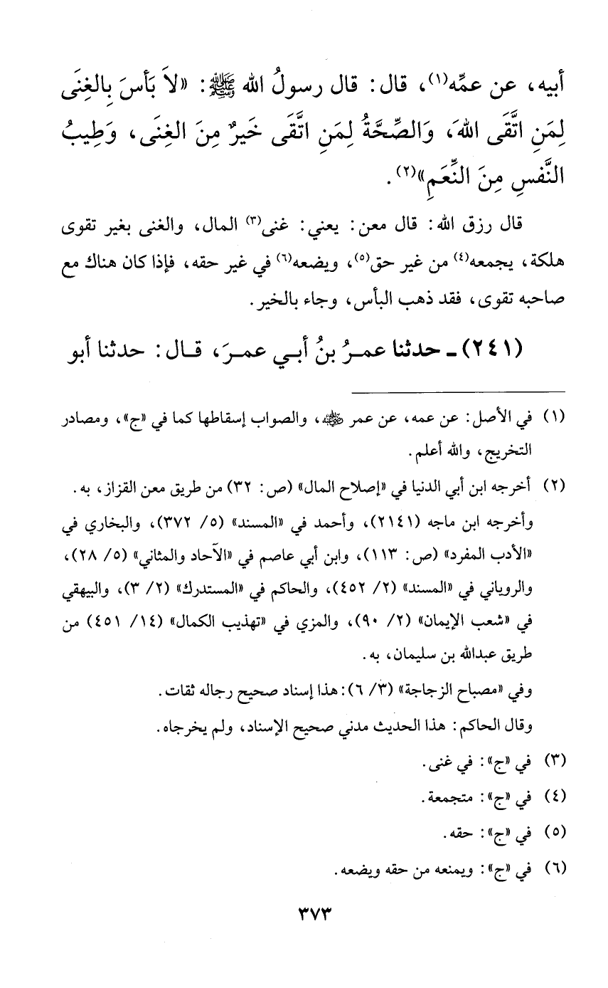 أبيه، عن عمه، قال: قال رسول الله صلى الله عليه وسلم: ((لا بأس بالغنى لمن اتقى الله، والصحة لمن اتقى خيرٌ من الغنى، وطيب النفس من النعم)).