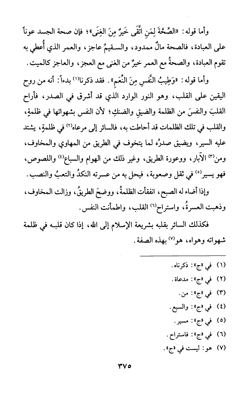 وأما قوله: ((وطيب النفس من النعم)). فقد ذكرنا بدءاً: أنه من روح اليقين على القلب، وهو النور الوارد الذي قد أشرق في الصدر، فأراح القلب والنفس من الظلمة والضيق والضنك؛ لأن النفس بشهواتها في ظلمةٍ، والقلب في تلك الظلمات قد أحاطت به، فالسائر إلى مرعاه في ظلمةٍ، يشتد عليه السير، ويضيق صدره لما يتخوف في الطريق من المهاوي والمخاوف، ومن الآبار، ووعورة الطريق، وغير ذلك من الهوام والسباع واللصوص، فهو يسير في ثقل وصعوبة، فيحل به من عسرته النكد والتعب والنصب.