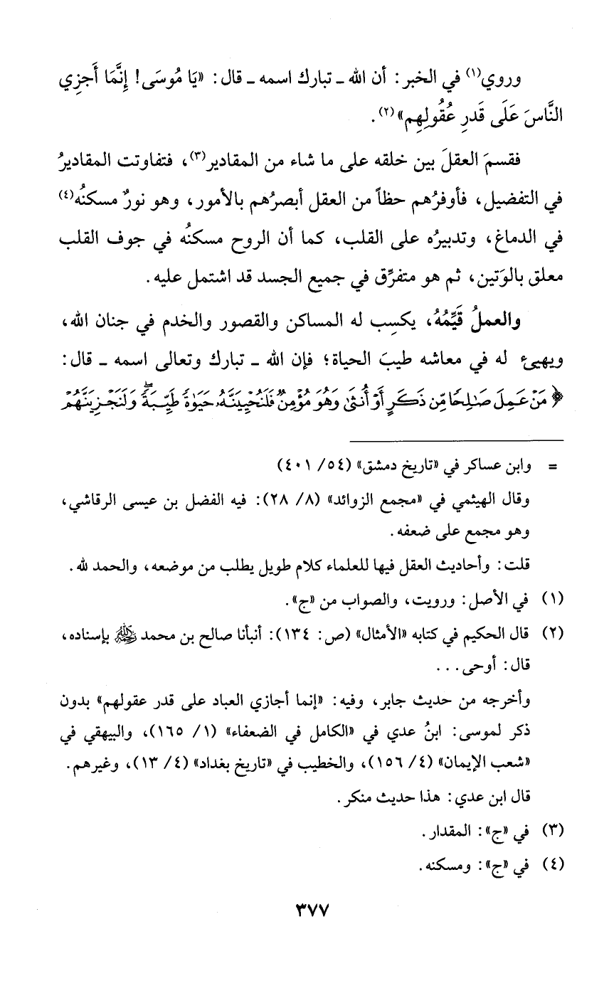 وروي في الخبر: أن الله -تبارك اسمه- قال: ((يا موسى! إنما أجزي الناس على قدر عقولهم)).