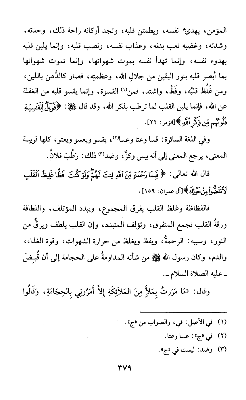 فالفظاظة وغلظ القلب يفرق المجموع، ويبدد المؤتلف، واللطافة ورقة القلب تجمع المتفرق، وتؤلف المتبدد، وإن القلب يلطف ويرق من النور وسببه: الرحمة، ويفظ ويغلظ من حرارة الشهوات، وقوة الغذاء، والدم، وكان رسول الله صلى الله عليه وسلم من شأنه المداومة على الحجامة إلى أن قبض -عليه الصلاة والسلام-.