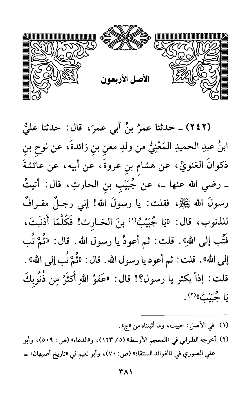242 - حدثنا عمر بن أبي عمر، قال: حدثنا علي ابن عبد الحميد المعني من ولد معن بن زائدة، عن نوح بن ذكوان الغنوي، عن هشام بن عروة، عن أبيه، عن عائشة -رضي الله عنها-، عن جبيب بن الحارث، قال: أتيت رسول الله صلى الله عليه وسلم، فقلت: يا رسول الله! إني رجلٌ مقرافٌ للذنوب، قال: ((يا جبيب بن الحارث! فكلما أذنبت، فتب إلى الله)). قلت: ثم أعود يا رسول الله. قال: ((ثم تب إلى الله)). قلت: ثم أعود يا رسول الله. قال: ((ثم تب إلى الله)). قلت: إذاً يكثر يا رسول الله؟! قال: ((عفو الله أكثر من ذنوبك يا جبيب)).