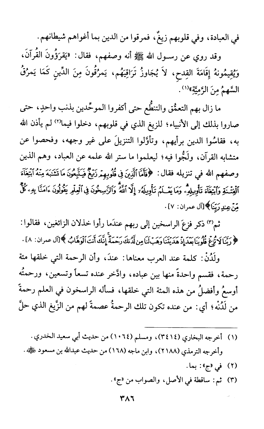 ما زال بهم التعمق والتنطع حتى أكفروا الموحدين بذنب واحدٍ، حتى صاروا بذلك إلى الأنبياء؛ للزيغ الذي في قلوبهم، دخلوا فيما لم يأذن الله به، فقاسوا الدين برأيهم، وتأولوا التنزيل على غير وجهه، وفحصوا عن متشابه القرآن، ولجوا فيه؛ ليعلموا ما ستر الله علمه عن العباد، وهم الذين وصفهم الله في تنزيله فقال: {فأما الذين في قلوبهم زيغٌ فيتبعون ما تشابه منه ابتغاء الفتنة وابتغاء تأويله وما يعلم تأويله إلا الله والراسخون في العلم يقولون آمنا به كلٌّ من عند ربنا}.