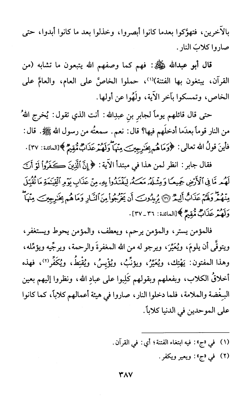 حتى قال قائلهم يوماً لجابر بن عبد الله: أنت الذي تقول: يخرج الله من النار قوماً بعدما أدخلهم فيها؟ قال: نعم. سمعته من رسول الله صلى الله عليه وسلم. قال: فأين قول الله تعالى: {وما هم بخارجين منها ولهم عذابٌ مقيمٌ}.