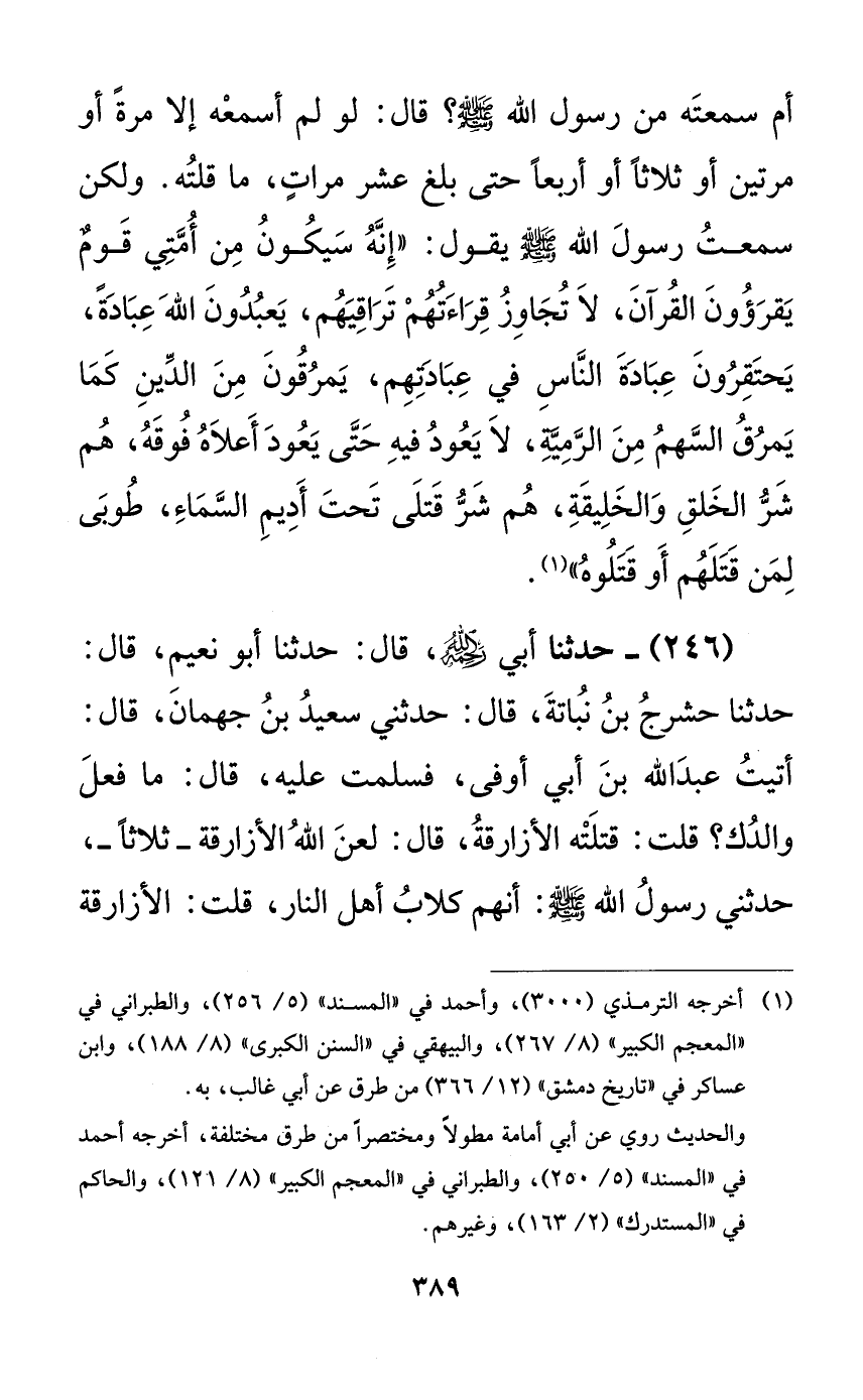 246 - حدثنا أبي رحمه الله، قال: حدثنا أبو نعيم، قال: حدثنا حشرج بن نباتة، قال: حدثني سعيد بن جهمان، قال: أتيت عبد الله بن أبي أوفى، فسلمت عليه، قال: ما فعل والدك؟ قلت: قتلته الأزارقة، قال: لعن الله الأزارقة -ثلاثاً-، حدثني رسول الله صلى الله عليه وسلم: أنهم كلاب أهل النار، قلت: الأزارقة