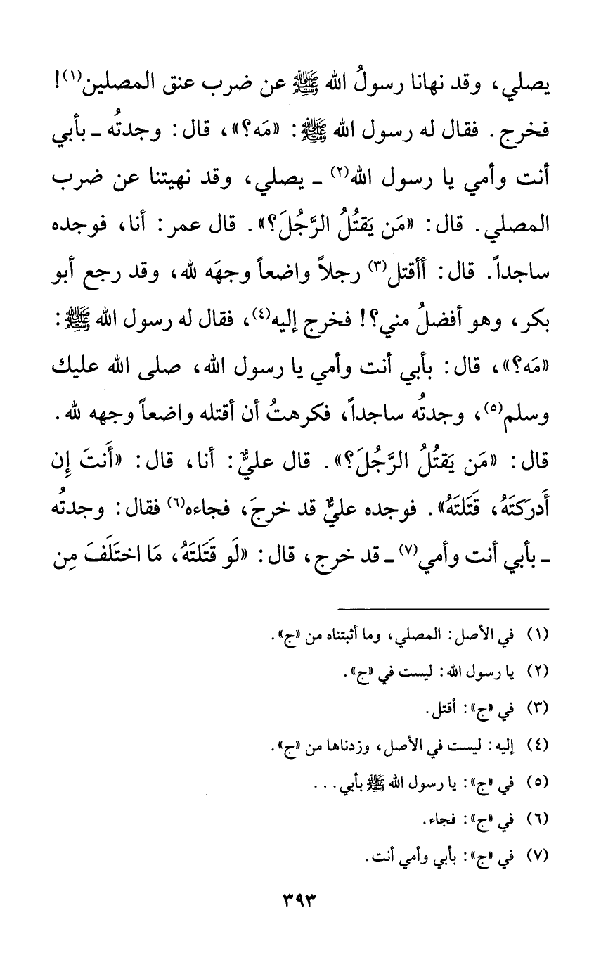 يصلي، وقد نهانا رسول الله صلى الله عليه وسلم عن ضرب عنق المصلين! فخرج. فقال له رسول الله صلى الله عليه وسلم: ((مه؟))، قال: وجدته -بأبي أنت وأمي يا رسول الله- يصلي، وقد نهيتنا عن ضرب المصلي. قال: ((من يقتل الرجل؟)). قال عمر: أنا، فوجده ساجداً. قال: أأقتل رجلاً واضعاً وجهه لله، وقد رجع أبو بكر، وهو أفضل مني؟! فخرج إليه، فقال له رسول الله صلى الله عليه وسلم: ((مه؟))، قال: بأبي أنت وأمي يا رسول الله، صلى الله عليك وسلم، وجدته ساجداً، فكرهت أن أقتله واضعاً وجهه لله. قال: ((من يقتل الرجل؟)). قال عليٌّ: أنا، قال: ((أنت إن أدركته، قتلته)). فوجده عليٌّ قد خرج، فجاءه فقال: وجدته -بأبي أنت وأمي- قد خرج، قال: ((لو قتلته، ما اختلف من