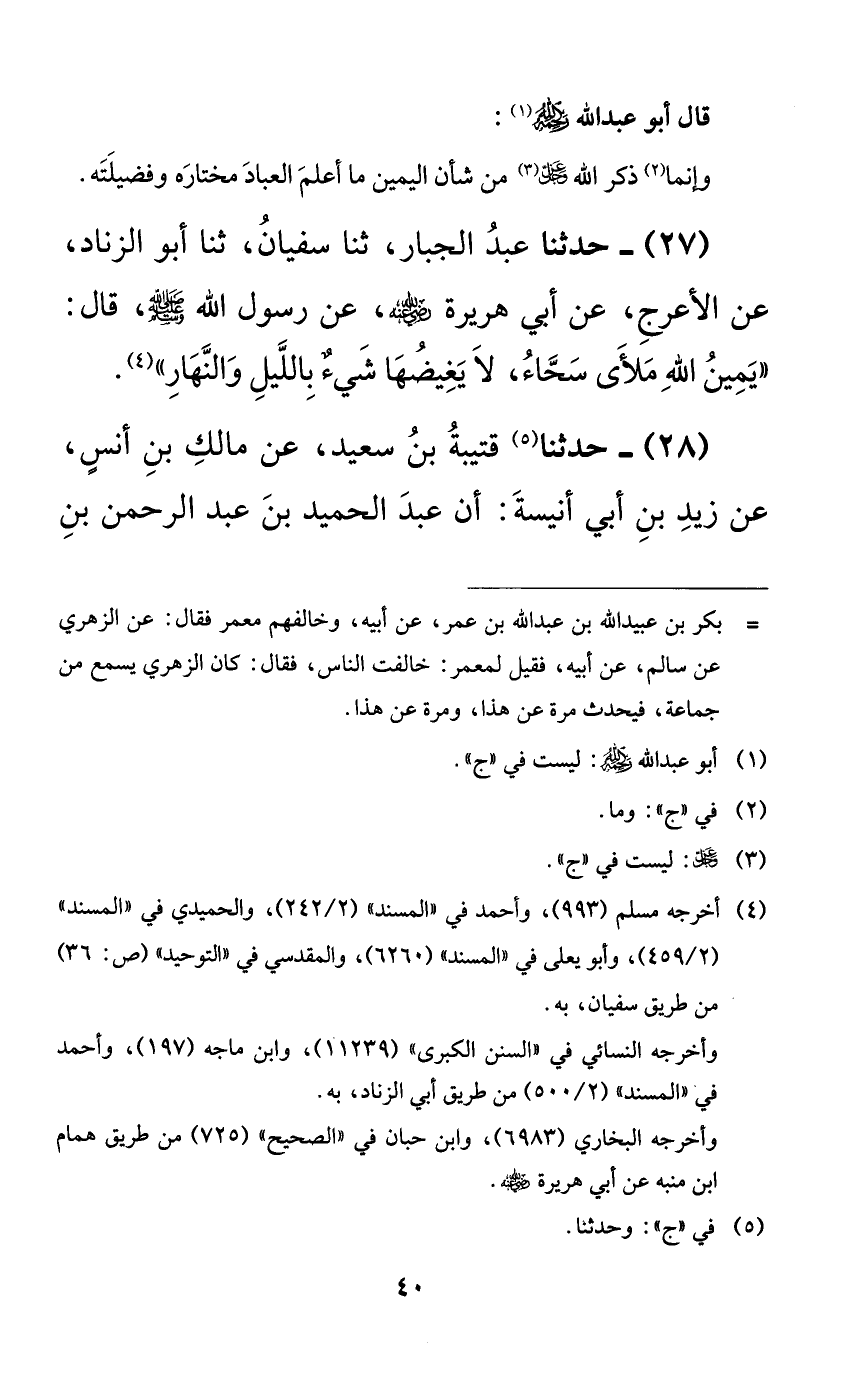 27 - حدثنا عبد الجبار، ثنا سفيان، ثنا أبو الزناد، عن الأعرج، عن أبي هريرة رضي الله عنه، عن رسول الله صلى الله عليه وسلم، قال: ((يمين الله ملأى سحاء، لا يغيضها شيءٌ بالليل والنهار)).