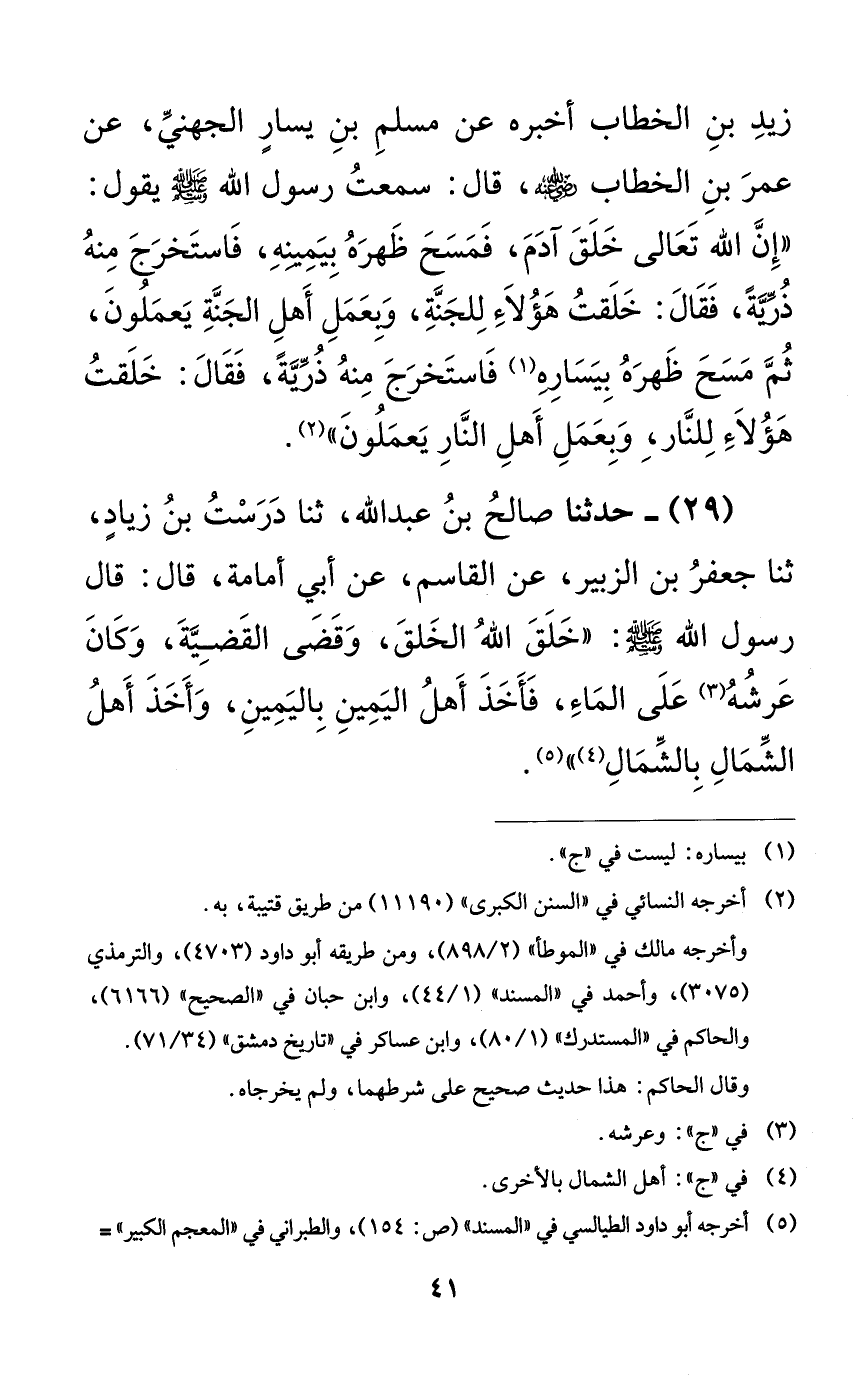 زيد بن الخطاب أخبره عن مسلم بن يسارٍ الجهني، عن عمر بن الخطاب رضي الله عنه، قال: سمعت رسول الله صلى الله عليه وسلم يقول: ((إن الله تعالى خلق آدم، فمسح ظهره بيمينه، فاستخرج منه ذريةً، فقال: خلقت هؤلاء للجنة، وبعمل أهل الجنة يعملون، ثم مسح ظهره بيساره فاستخرج منه ذريةً، فقال: خلقت هؤلاء للنار، وبعمل أهل النار يعملون)).