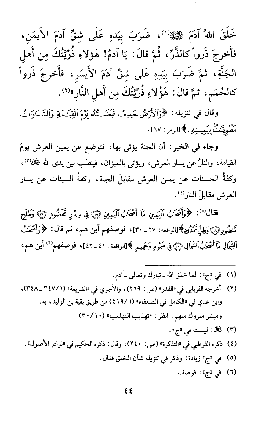 خلق الله آدم عليه السلام، ضرب بيده على شق آدم الأيمن، فأخرج ذرواً كالذر، ثم قال: يا آدم! هؤلاء ذريتك من أهل الجنة، ثم ضرب بيده على شق آدم الأيسر، فأخرج ذرواً كالحمم، ثم قال: هؤلاء ذريتك من أهل النار)).