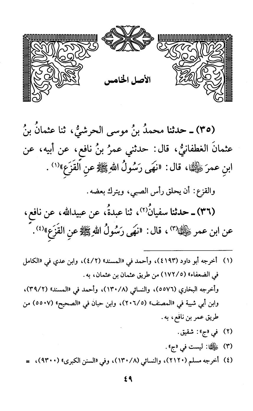 35 - حدثنا محمد بن موسى الحرشي، ثنا عثمان بن عثمان الغطفاني، قال: حدثني عمر بن نافعٍ، عن أبيه، عن ابن عمر رضي الله عنهما، قال: ((نهى رسول الله صلى الله عليه وسلم عن القزع)).