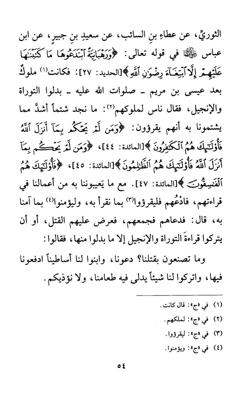 الثوري، عن عطاء بن السائب، عن سعيد بن جبيرٍ، عن ابن عباس رضي الله عنهما في قوله تعالى: {ورهبانيةً ابتدعوها ما كتبناها عليهم إلا ابتغاء رضوان الله}: فكانت ملوكٌ بعد عيسى بن مريم -صلوات الله عليه- بدلوا التوراة والإنجيل، فقال ناس لملوكهم: ما نجد شتماً أشد مما يشتمونا به أنهم يقرؤون: {ومن لم يحكم بما أنزل الله فأولئك هم الكافرون}، {ومن لم يحكم بما أنزل الله فأولئك هم الظالمون}، {فأولئك هم الفاسقون}. مع ما يعيبوننا به من أعمالنا في قراءتهم، فادعهم فليقرؤوا بما نقرأ به، وليؤمنوا بما آمنا به، قال: فدعاهم فجمعهم، فعرض عليهم القتل، أو أن يتركوا قراءة التوراة والإنجيل إلا ما بدلوا منها، فقالوا: