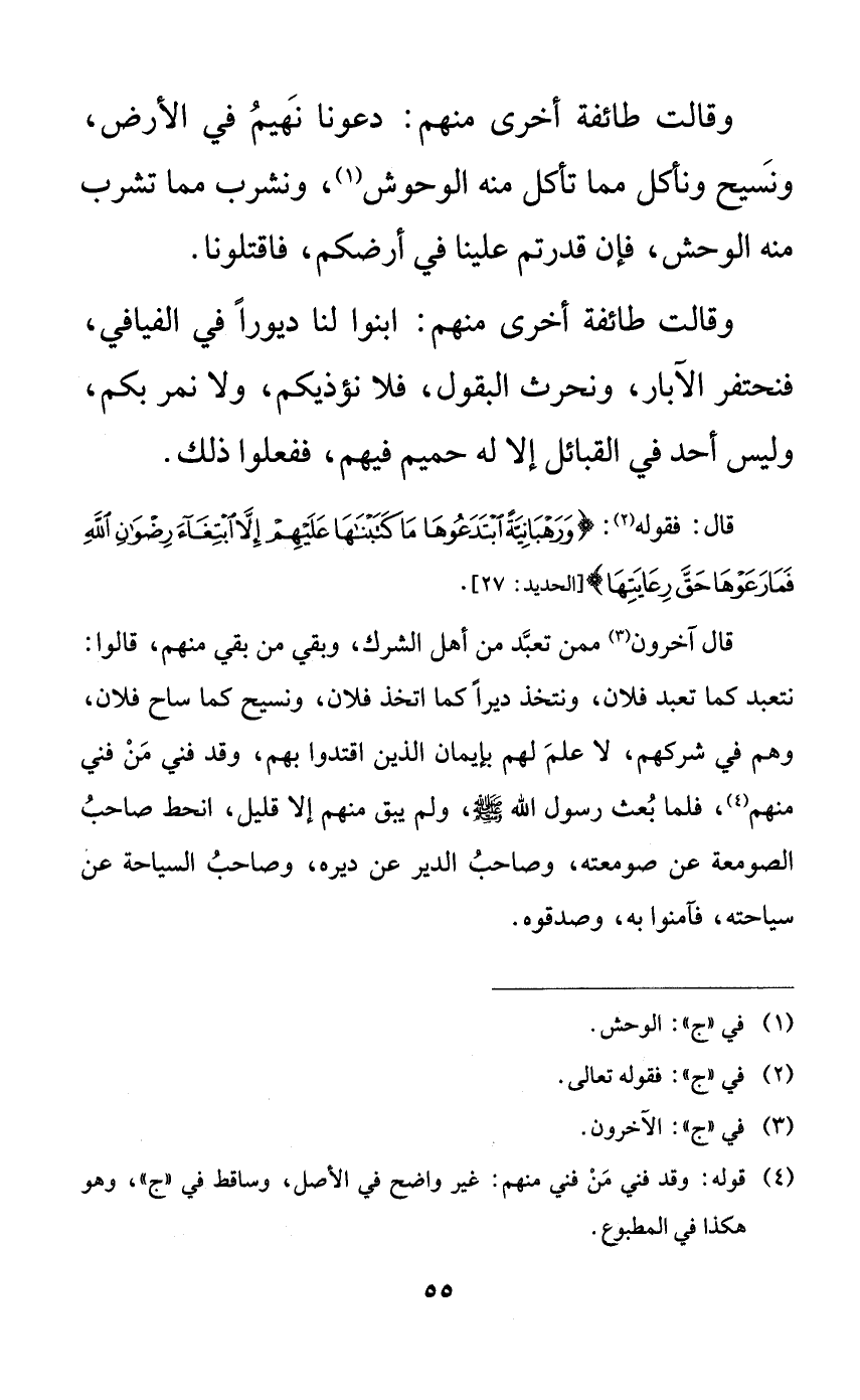 قال: فقوله: {ورهبانيةً ابتدعوها ما كتبناها عليهم إلا ابتغاء رضوان الله فما رعوها حق رعايتها}.