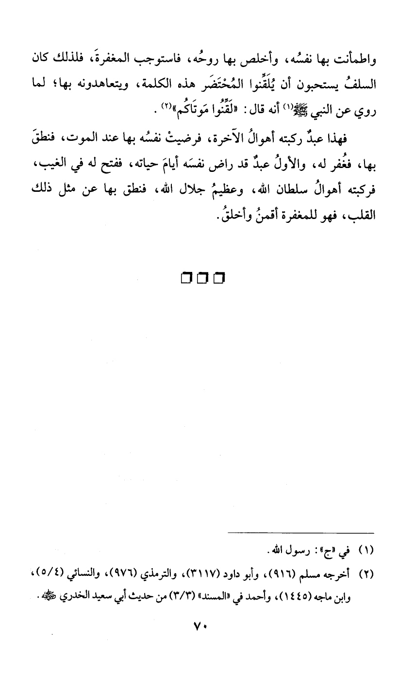 واطمأنت بها نفسه، وأخلص بها روحه، فاستوجب المغفرة، فلذلك كان السلف يستحبون أن يلقنوا المحتضر هذه الكلمة، ويتعاهدونه بها؛ لما روي عن النبي صلى الله عليه وسلم أنه قال: ((لقنوا موتاكم)).