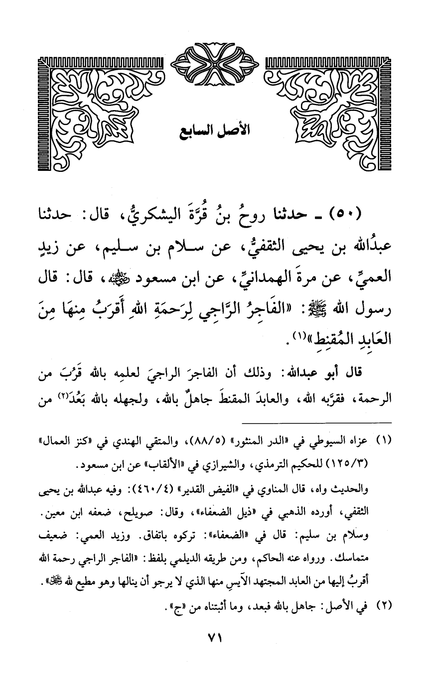 50 - حدثنا روح بن قرة اليشكري، قال: حدثنا عبد الله بن يحيى الثقفي، عن سلام بن سليم، عن زيدٍ العمي، عن مرة الهمداني، عن ابن مسعود رضي الله عنه، قال: قال رسول الله صلى الله عليه وسلم: ((الفاجر الراجي لرحمة الله أقرب منها من العابد المقنط).
