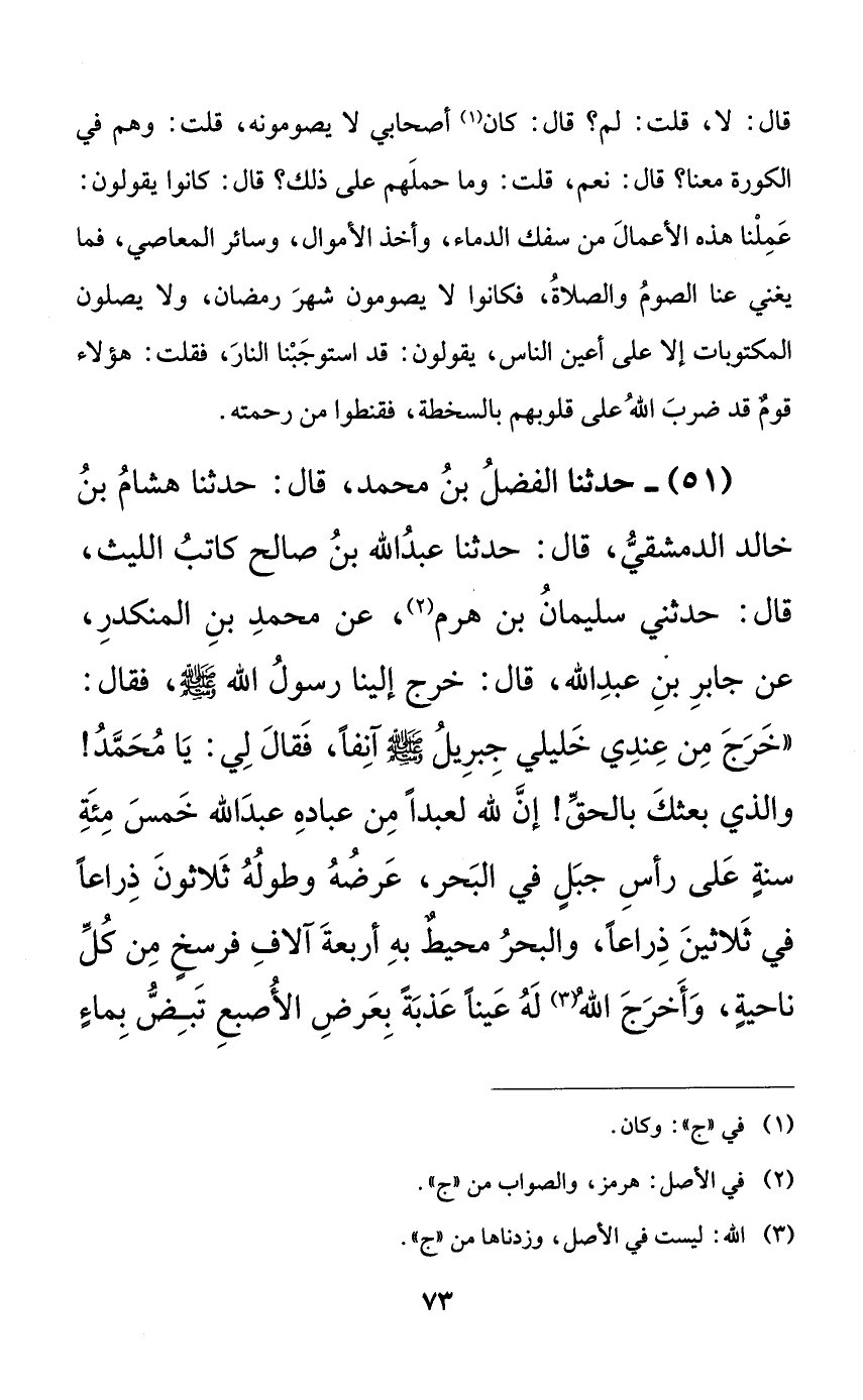 51 - حدثنا الفضل بن محمد، قال: حدثنا هشام بن خالد الدمشقي، قال: حدثنا عبد الله بن صالح كاتب الليث، قال: حدثني سليمان بن هرم، عن محمد بن المنكدر، عن جابر بن عبد الله، قال: خرج إلينا رسول الله صلى الله عليه وسلم، فقال: ((خرج من عندي خليلي جبريل صلى الله عليه وسلم آنفاً، فقال لي: يا محمد! والذي بعثك بالحق! إن لله لعبداً من عباده عبد الله خمس مئة سنةٍ على رأس جبلٍ في البحر، عرضه وطوله ثلاثون ذراعاً في ثلاثين ذراعاً، والبحر محيطٌ به أربعة آلاف فرسخٍ من كل ناحيةٍ، وأخرج الله له عيناً عذبةً بعرض الأصبع تبض بماءٍ