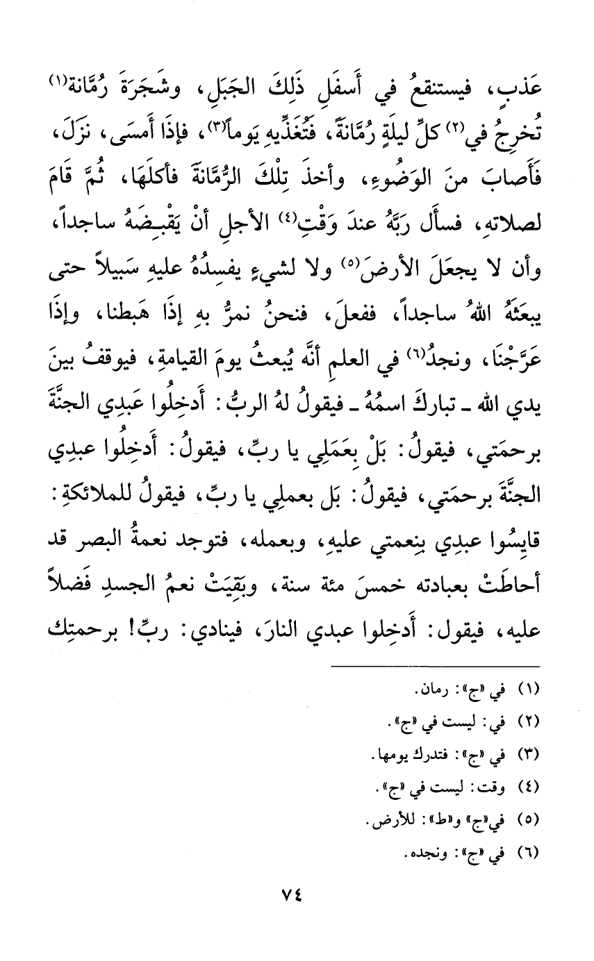 عذبٍ، فيستنقع في أسفل ذلك الجبل، وشجرة رمانة تخرج في كل ليلةٍ رمانةً، فتغذيه يوماً، فإذا أمسى، نزل، فأصاب من الوضوء، وأخذ تلك الرمانة فأكلها، ثم قام لصلاته، فسأل ربه عند وقت الأجل أن يقبضه ساجداً، وأن لا يجعل الأرض ولا لشيءٍ يفسده عليه سبيلاً حتى يبعثه الله ساجداً، ففعل، فنحن نمر به إذا هبطنا، وإذا عرجنا، ونجد في العلم أنه يبعث يوم القيامة، فيوقف بين يدي الله -تبارك اسمه- فيقول له الرب: أدخلوا عبدي الجنة برحمتي، فيقول: بل بعملي يا رب، فيقول: أدخلوا عبدي الجنة برحمتي، فيقول: بل بعملي يا رب، فيقول للملائكة: قايسوا عبدي بنعمتي عليه، وبعمله، فتوجد نعمة البصر قد أحاطت بعبادته خمس مئة سنة، وبقيت نعم الجسد فضلاً عليه، فيقول: أدخلوا عبدي النار، فينادي: رب! برحمتك