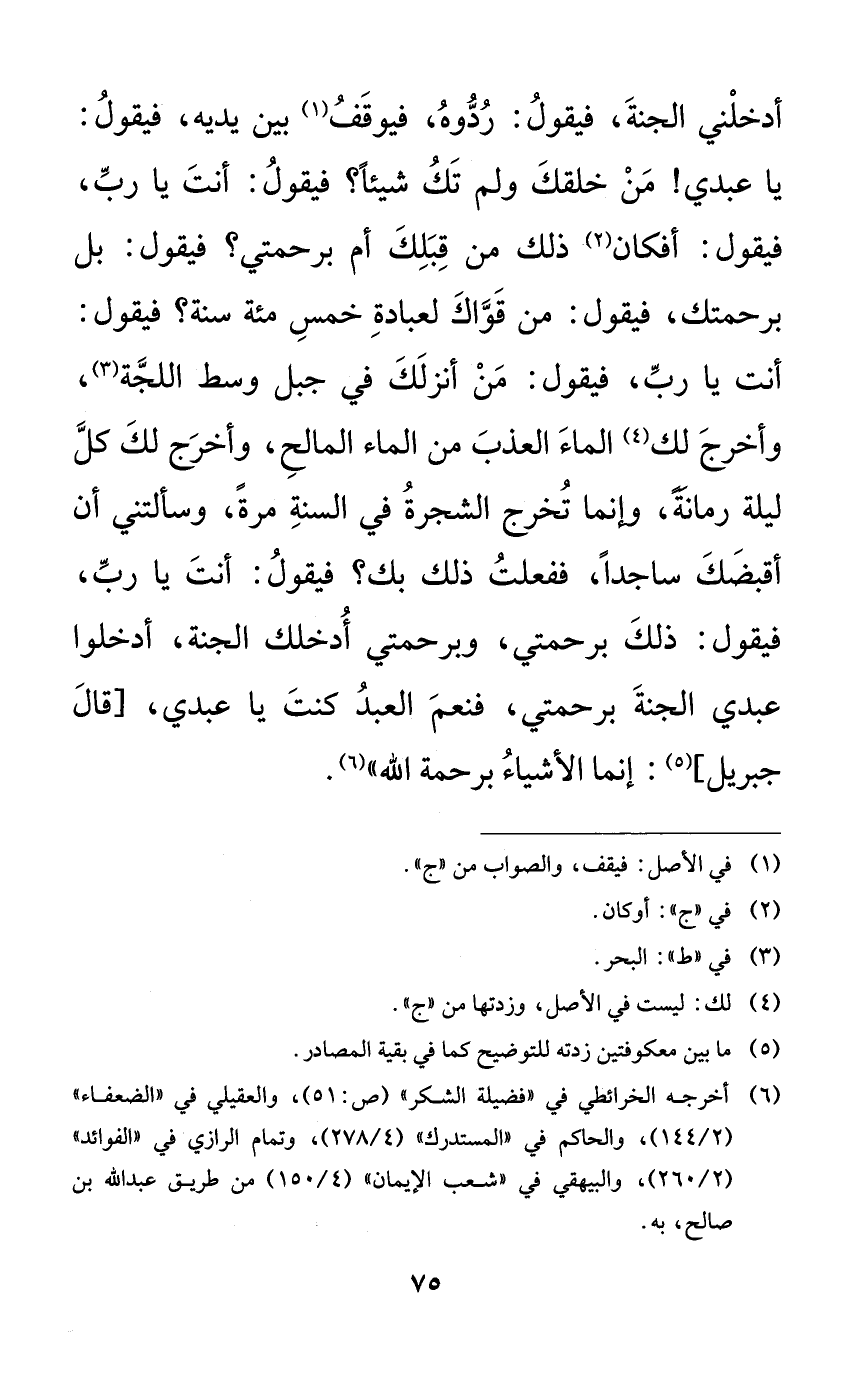 أدخلني الجنة، فيقول: ردوه، فيوقف بين يديه، فيقول: يا عبدي! من خلقك ولم تك شيئاً؟ فيقول: أنت يا رب، فيقول: أفكان ذلك من قبلك أم برحمتي؟ فيقول: بل برحمتك، فيقول: من قواك لعبادة خمس مئة سنة؟ فيقول: أنت يا رب، فيقول: من أنزلك في جبل وسط اللجة، وأخرج لك الماء العذب من الماء المالح، وأخرج لك كل ليلة رمانةً، وإنما تخرج الشجرة في السنة مرةً، وسألتني أن أقبضك ساجداً، ففعلت ذلك بك؟ فيقول: أنت يا رب، فيقول: ذلك برحمتي، وبرحمتي أدخلك الجنة، أدخلوا عبدي الجنة برحمتي، فنعم العبد كنت يا عبدي، [قال جبريل]: إنما الأشياء برحمة الله)).