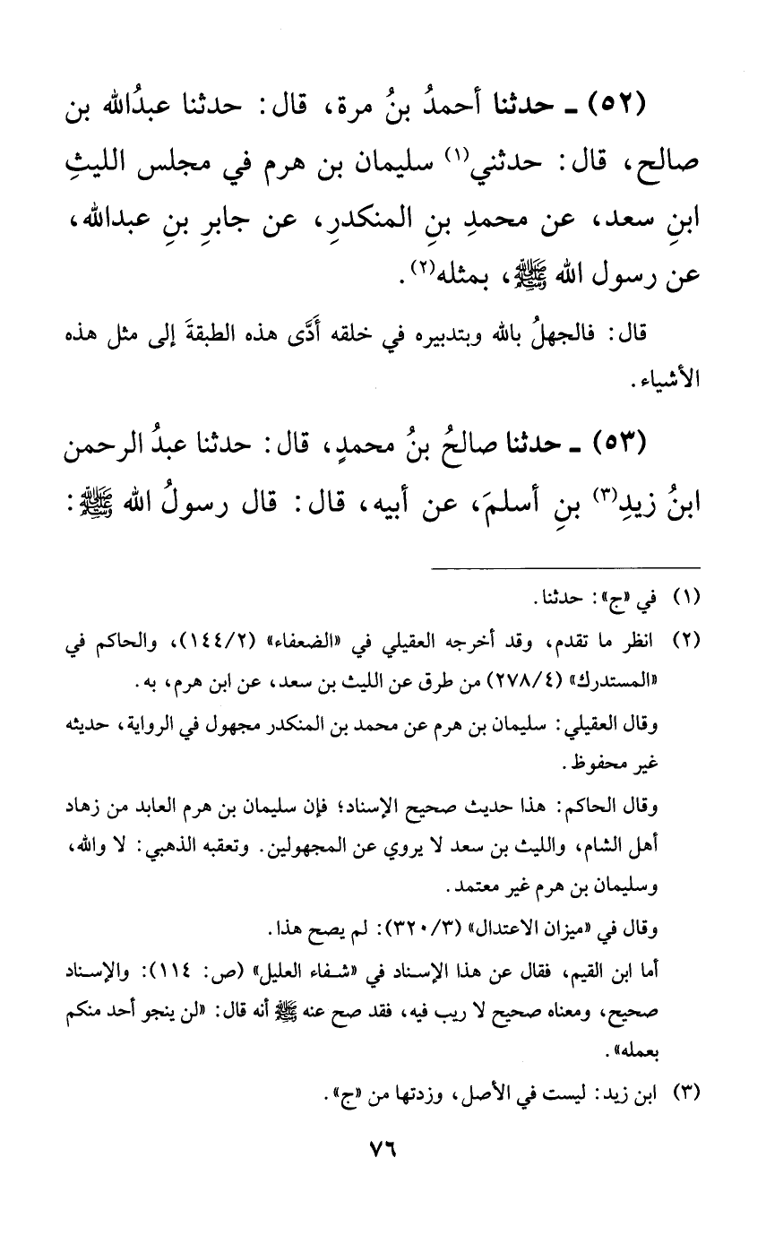 52 - حدثنا أحمد بن مرة، قال: حدثنا عبد الله بن صالح، قال: حدثني سليمان بن هرم في مجلس الليث ابن سعد، عن محمد بن المنكدر، عن جابر بن عبد الله، عن رسول الله صلى الله عليه وسلم، بمثله.