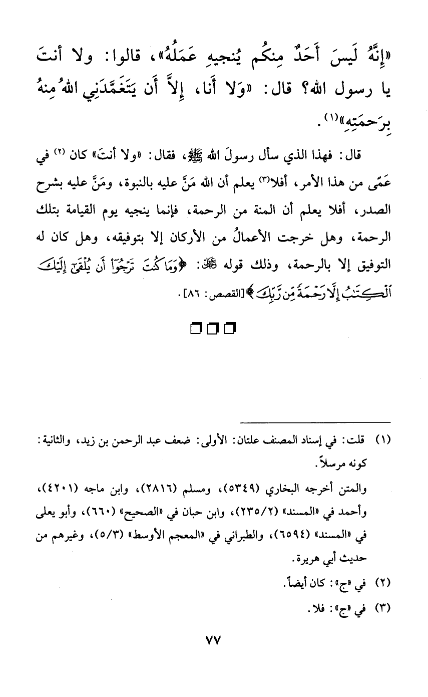قال: فهذا الذي سأل رسول الله صلى الله عليه وسلم، فقال: ((ولا أنت)) كان في عمىً من هذا الأمر، أفلا يعلم أن الله منَّ عليه بالنبوة، ومنَّ عليه بشرح الصدر، أفلا يعلم أن المنة من الرحمة، فإنما ينجيه يوم القيامة بتلك الرحمة، وهل خرجت الأعمال من الأركان إلا بتوفيقه، وهل كان له التوفيق إلا بالرحمة، وذلك قوله عز وجل: {وما كنت ترجوا أن يلقى إليك الكتاب إلا رحمةً من ربك}.