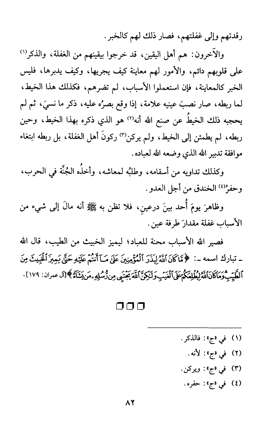 والآخرون: هم أهل اليقين، قد خرجوا بيقينهم من الغفلة، والذكر على قلوبهم دائم، والأمور لهم معاينة كيف يجريها، وكيف يدبرها، فليس الخبر كالمعاينة، فإن استعملوا الأسباب، فلم تضرهم، فكذلك هذا الخيط، لما ربطه، صار نصب عينيه علامة، إذا وقع بصره عليه، ذكر ما نسي، ثم لم يحجبه ذلك الخيط عن صنع الله أنه هو الذي ذكره بهذا الخيط، وحين ربطه، لم يطمئن إلى الخيط، ولم يركن ركون أهل الغفلة، بل ربطه ابتغاء موافقة تدبير الله الذي وضعه الله لعباده.