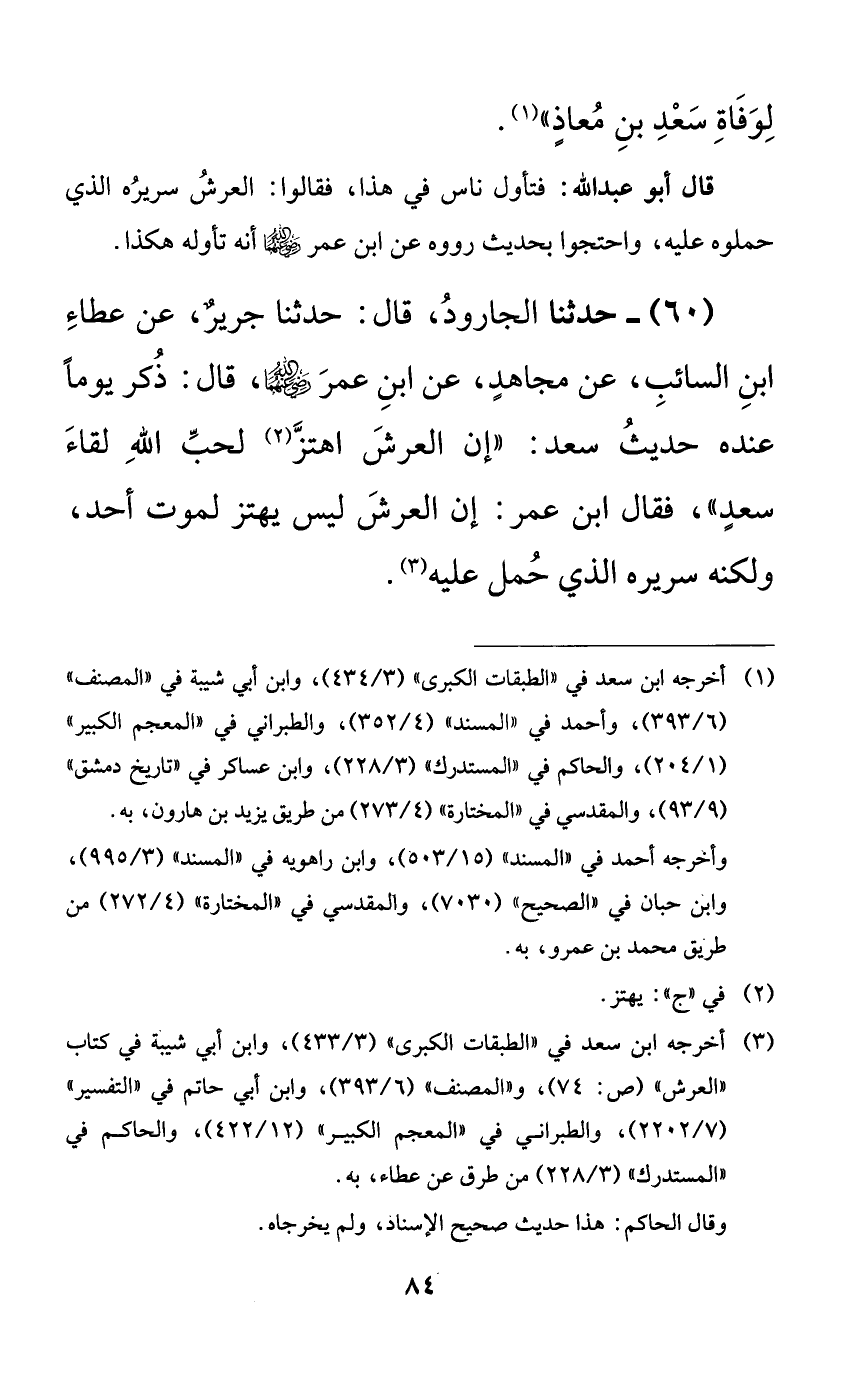 60 - حدثنا الجارود، قال: حدثنا جريرٌ، عن عطاء ابن السائب، عن مجاهدٍ، عن ابن عمر رضي الله عنهما، قال: ذكر يوماً عنده حديث سعد: ((إن العرش اهتز لحب الله لقاء سعدٍ))، فقال ابن عمر: إن العرش ليس يهتز لموت أحد، ولكنه سريره الذي حمل عليه.