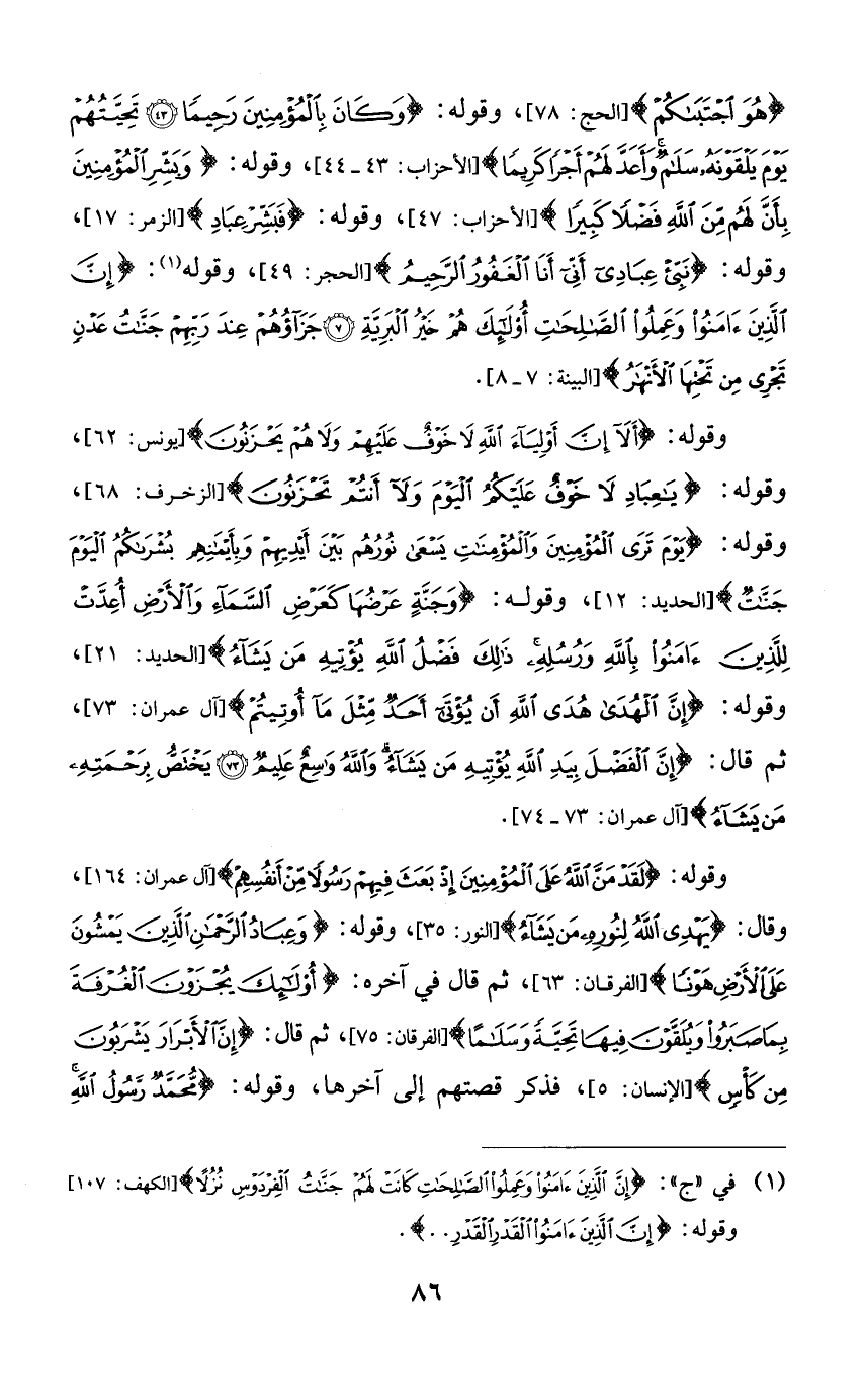 وقوله: {ألا إن أولياء الله لا خوفٌ عليهم ولا هم يحزنون}، وقوله: {يا عباد لا خوفٌ عليكم اليوم ولا أنتم تحزنون}، وقوله: {يوم ترى المؤمنين والمؤمنات يسعى نورهم بين أيديهم وبأيمانهم بشراكم اليوم جناتٌ}، وقوله: {وجنةٍ عرضها كعرض السماء والأرض أعدت للذين آمنوا بالله ورسله ذلك فضل الله يؤتيه من يشاء}، وقوله: {إن الهدى هدى الله أن يؤتى أحدٌ مثل ما أوتيتم}، ثم قال: {إن الفضل بيد الله يؤتيه من يشاء والله واسعٌ عليمٌ. يختص برحمته من يشاء}.