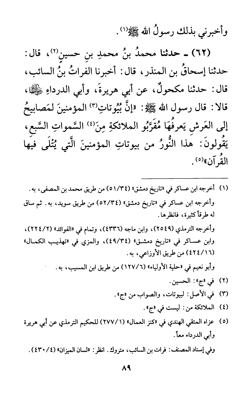 62 - حدثنا محمد بن محمد بن حسين، قال: حدثنا إسحاق بن المنذر، قال: أخبرنا الفرات بن السائب، قال: حدثنا مكحولٌ، عن أبي هريرة، وأبي الدرداء رضي الله عنهما، قالا: قال رسول الله صلى الله عليه وسلم: ((إن بيوتات المؤمنين لمصابيح إلى العرش يعرفها مقربو الملائكة من السماوات السبع، يقولون: هذا النور من بيوتات المؤمنين التي يتلى فيها القرآن)).