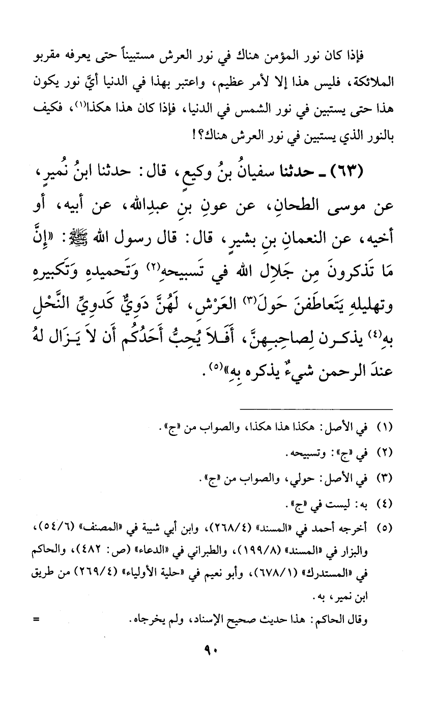 63 - حدثنا سفيان بن وكيعٍ، قال: حدثنا ابن نمير، عن موسى الطحان، عن عون بن عبد الله، عن أبيه، أو أخيه، عن النعمان بن بشيرٍ، قال: قال رسول الله صلى الله عليه وسلم: ((إن ما تذكرون من جلال الله في تسبيحه وتحميده وتكبيره وتهليله يتعاطفن حول العرش، لهن دويٌّ كدوي النحل به يذكرن لصاحبهن، أفلا يحب أحدكم أن لا يزال له عند الرحمن شيءٌ لا يذكره به)).