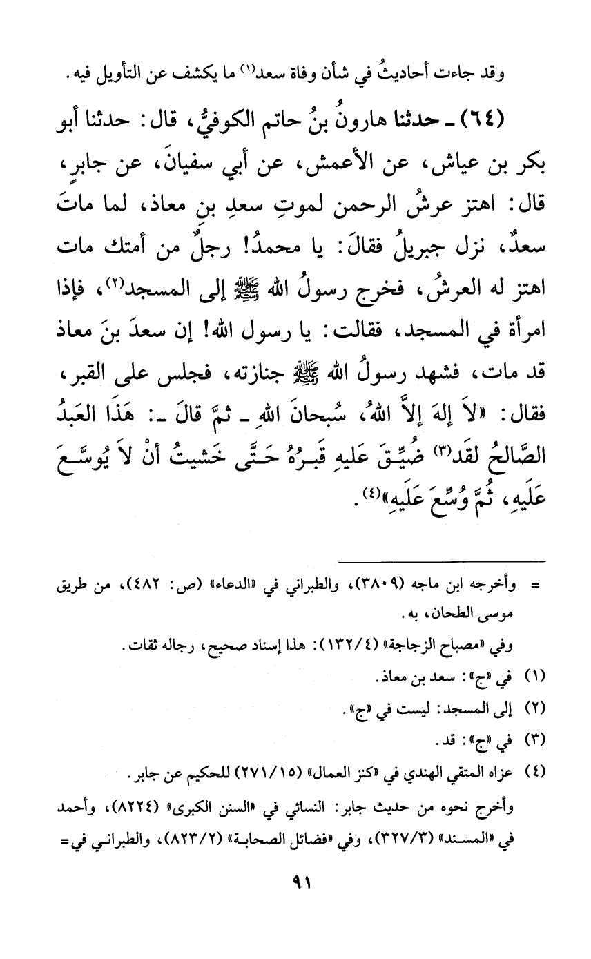 64 - حدثنا هارون بن حاتم الكوفي، قال: حدثنا أبو بكر بن عياش، عن الأعمش، عن أبي سفيان، عن جابرٍ، قال: اهتز عرش الرحمن لموت سعد بن معاذ، لما مات سعدٌ، نزل جبريل فقال: يا محمد! رجلٌ من أمتك مات اهتز له العرش، فخرج رسول الله صلى الله عليه وسلم إلى المسجد، فإذا امرأة في المسجد، فقالت: يا رسول الله! إن سعد بن معاذ قد مات، فشهد رسول الله صلى الله عليه وسلم جنازته، فجلس على القبر، فقال: ((لا إله إلا الله، سبحان الله -ثم قال-: هذا العبد الصالح لقد ضيق عليه قبره حتى خشيت أن لا يوسع عليه، ثم وسع عليه)).