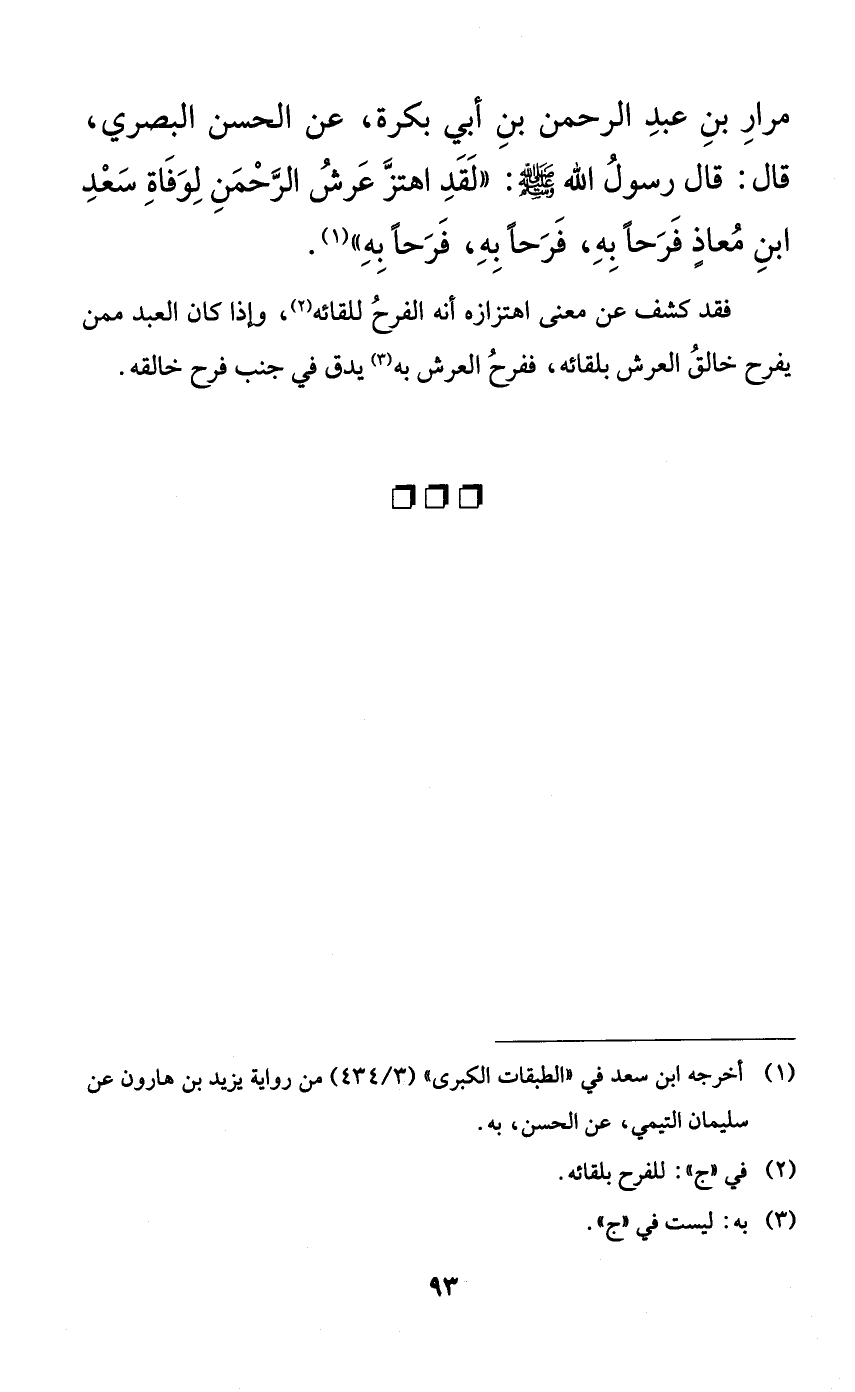 مرار بن عبد الرحمن بن أبي بكرة، عن الحسن البصري، قال: قال رسول الله صلى الله عليه وسلم: ((لقد اهتز عرش الرحمن لوفاة سعد ابن معاذٍ فرحاً به، فرحاً به، فرحاً به)).