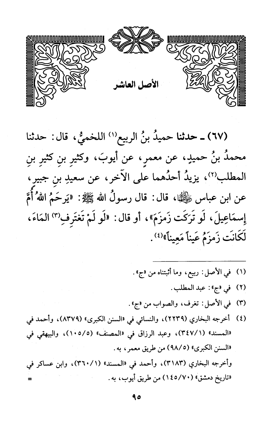67 - حدثنا حميد بن الربيع اللخمي، قال: حدثنا محمد بن حميدٍ، عن معمرٍ، عن أيوب، وكثير بن كثير بن المطلب، يزيد أحدهما على الآخر، عن سعيد بن جبير، عن ابن عباس رضي الله عنهما، قال: قال رسول الله صلى الله عليه وسلم: ((يرحم الله أم إسماعيل، لو تركت زمزم))، أو قال: ((لو لم تغترف الماء، لكانت زمزم عيناً معيناً)).