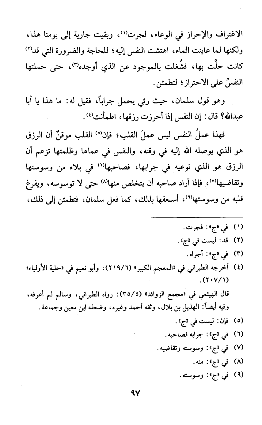 فهذا عمل النفس ليس عمل القلب؛ فإن القلب موقنٌ أن الرزق هو الذي يوصله الله إليه في وقته، والنفس في عماها وظلمتها تزعم أن الرزق هو الذي توعيه في جرابها، فصاحبها في بلاء من وسوستها وتقاضيها، فإذا أراد صاحبه أن يتخلص منها حتى لا توسوسه، ويفرغ قلبه من وسوستها، أسعفها بذلك، كما فعل سلمان، فتطمئن إلى ذلك،