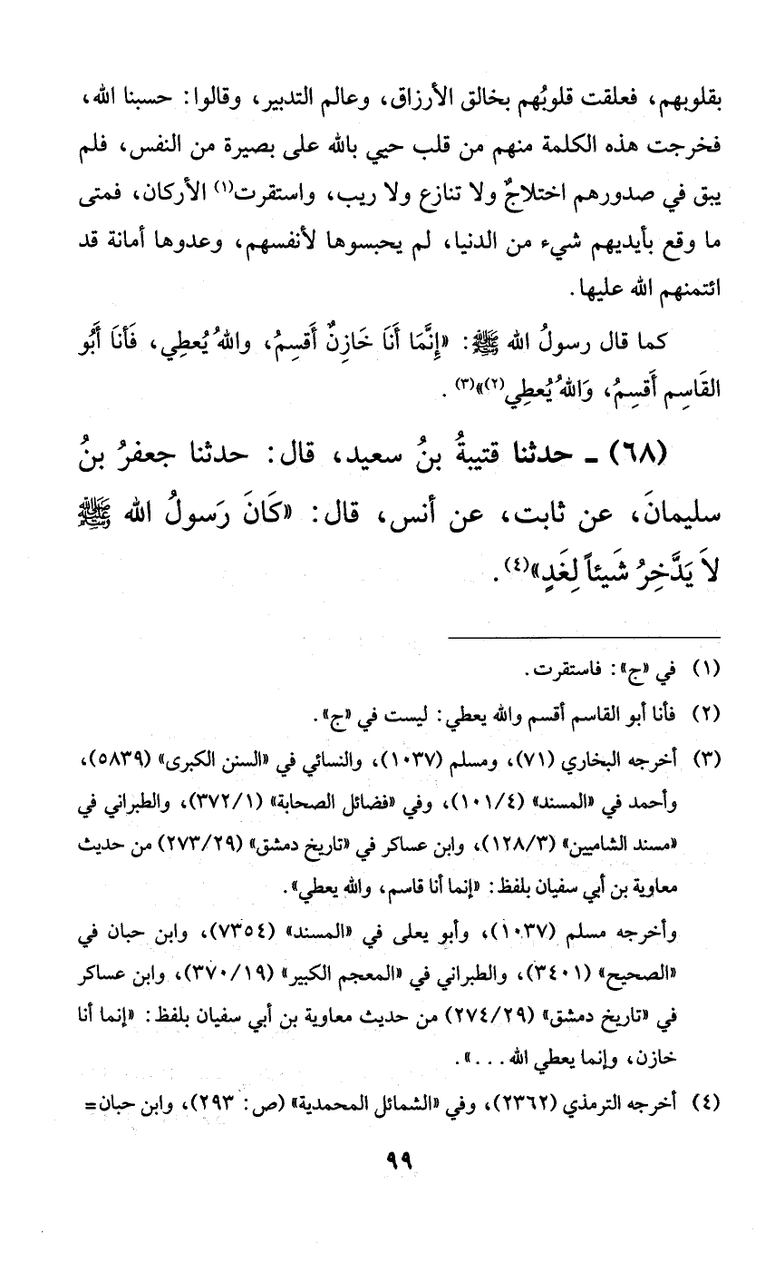 68 - حدثنا قتيبة بن سعيد، قال: حدثنا جعفر بن سليمان، عن ثابت، عن أنس، قال: ((كان رسول الله صلى الله عليه وسلم لا يدخر شيئاً لغدٍ)).