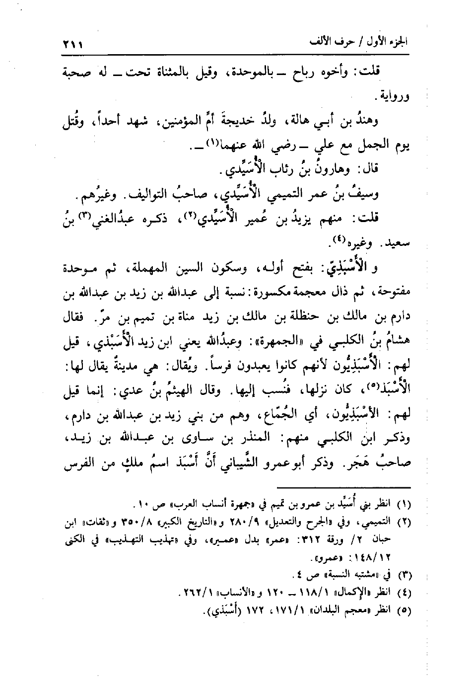 قلت: وَأَخُوهُ رَبَاح - بِالْمُوَحَّدَةِ وَقيل بِالْمُثَنَّاةِ تَحت - لَهُ صُحْبَة وَرِوَايَة. وَهِنْد بن أبي هَالة ولد خَدِيجَة أم الْمُؤمنِينَ شهد أحدا وَقتل يَوْم الْجمل مَعَ عَليّ - رَضِي الله عَنْهُمَا -. قَالَ: وَهَارُون بن رِئَاب الأسيدي. وَسيف بن عمر التَّمِيمِي الاسيدي صَاحب التواليف. وَغَيرهم. قلت: مِنْهُم يزِيد بن عُمَيْر الاسيدي ذكره عبد الْغَنِيّ بن سعيد. وَغَيره. والأسبذي: بِفَتْح أَوله وَسُكُون السِّين الْمُهْملَة ثمَّ مُوَحدَة مَفْتُوحَة ثمَّ ذال مُعْجمَة مَكْسُورَة: نِسْبَة إِلَى عبد الله بن زيد بن عبد الله بن درام بن مَالك بن حَنْظَلَة بن مَالك بن زيد مَنَاة بن تَمِيم بن مر. فَقَالَ هِشَام بن الْكَلْبِيّ فِي الجمهرة: وَعبد الله يَعْنِي ابْن زيد الأسبذي قيل لَهُم: الاسبذيون لأَنهم كَانُوا يعْبدُونَ فرسا. وَيُقَال: هِيَ مَدِينَة يُقَال لَهَا: الاسبذ كَانَ نزلها فنسب إِلَيْهَا. وَقَالَ الْهَيْثَم بن عدي: إِنَّمَا قيل لَهُم: الاسبذيون أَي الْجِمَاع وهم من بني زيد بن عبد الله بن دارم وَذكر ابْن الْكَلْبِيّ مِنْهُم: الْمُنْذر بن سَاوَى بن عبد الله بن زيد صَاحب هجر. وَذكر أَبُو عَمْرو الشَّيْبَانِيّ أَن اسبذ اسْم ملك من الْفرس