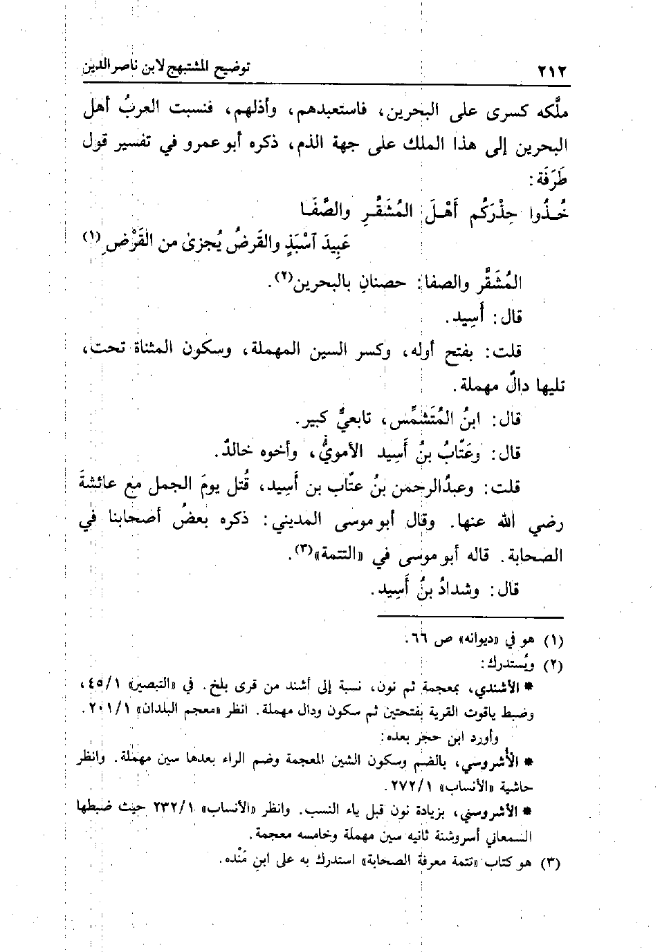 المشقر والصفا: حصنان بِالْبَحْرَيْنِ. قَالَ: اسيد. قلت بِفَتْح اوله وَكسر السِّين الْمُهْملَة وَسُكُون الْمُثَنَّاة تَحت تَلِيهَا دَال مُهْملَة. قَالَ: ابْن المتشمس تَابِعِيّ كَبِير. قَالَ: وعتاب بن اسيد الاموي وَأَخُوهُ خَالِد. قلت: وَعبد الرَّحْمَن بن عتاب بن اسيد قتل يَوْم الْجمل مَعَ عَائِشَة رَضِي الله عَنْهَا. وَقَالَ أَبُو مُوسَى الْمَدِينِيّ: ذكره بعض أَصْحَابنَا فِي الصَّحَابَة. قَالَه أَبُو مُوسَى فِي التَّتِمَّة. قَالَ: وَشَدَّاد بن أسيد.