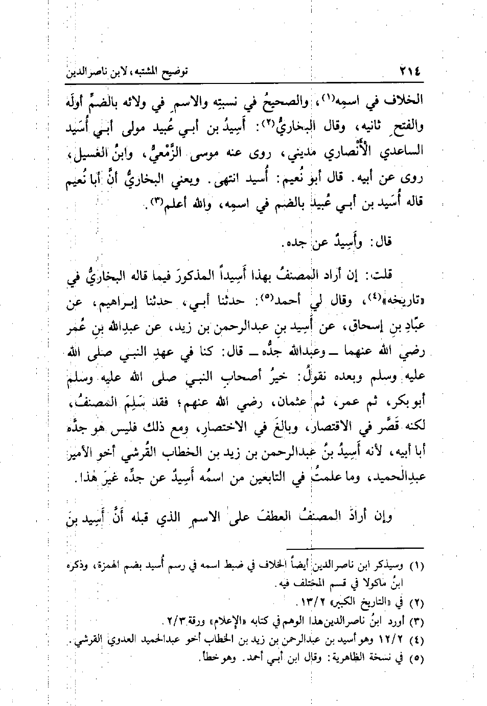 الْخلاف فِي اسْمه وَالصَّحِيح فِي نسبته وَالِاسْم فِي ولائه بِالضَّمِّ أَوله وَالْفَتْح ثَانِيه وَقَالَ البُخَارِيّ: اسيد بن أبي عبيد مولى أبي اسيد السَّاعِدِيّ الْأنْصَارِيّ مديني روى عَنهُ مُوسَى الزمعِي وَابْن الغسيل روى عَن أَبِيه. قَالَ أَبُو نعيم: اسيد انْتهى. وَيَعْنِي البُخَارِيّ أَن أَبَا نعيم قَالَه اسيد بن أبي عبيد بِالضَّمِّ فِي اسْمه وَالله أعلم. قَالَ: واسيد عَن جده. قلت: إِن أَرَادَ المُصَنّف بِهَذَا اسيدا الْمَذْكُور فِيمَا قَالَه البُخَارِيّ فِي تَارِيخه وَقَالَ لي أَحْمد: حَدثنَا أبي حَدثنَا إِبْرَاهِيم عَن عباد بن إِسْحَاق عَن اسيد بن عبد الرَّحْمَن بن زيد عَن عبد الله بن عمر رَضِي الله عَنْهُمَا - وَعبد الله جده - قَالَ: كُنَّا فِي عهد النَّبِي صلى الله عَلَيْهِ وَسلم وَبعده نقُول: خير أَصْحَاب النَّبِي صلى الله عَلَيْهِ وَسلم أَبُو بكر ثمَّ عمر ثمَّ عُثْمَان رَضِي الله عَنْهُم فقد سلم المُصَنّف لكنه قصر فِي الِاقْتِصَار وَبَالغ فِي الِاخْتِصَار وَمَعَ ذَلِك فَلَيْسَ هُوَ الْأَمِير عبد الحميد وَمَا علمت فِي التَّابِعين من اسْمه اسيد عَن جده غير هَذَا. وَإِن أَرَادَ المُصَنّف الْعَطف على الِاسْم الَّذِي قبله أَن اسيد بن