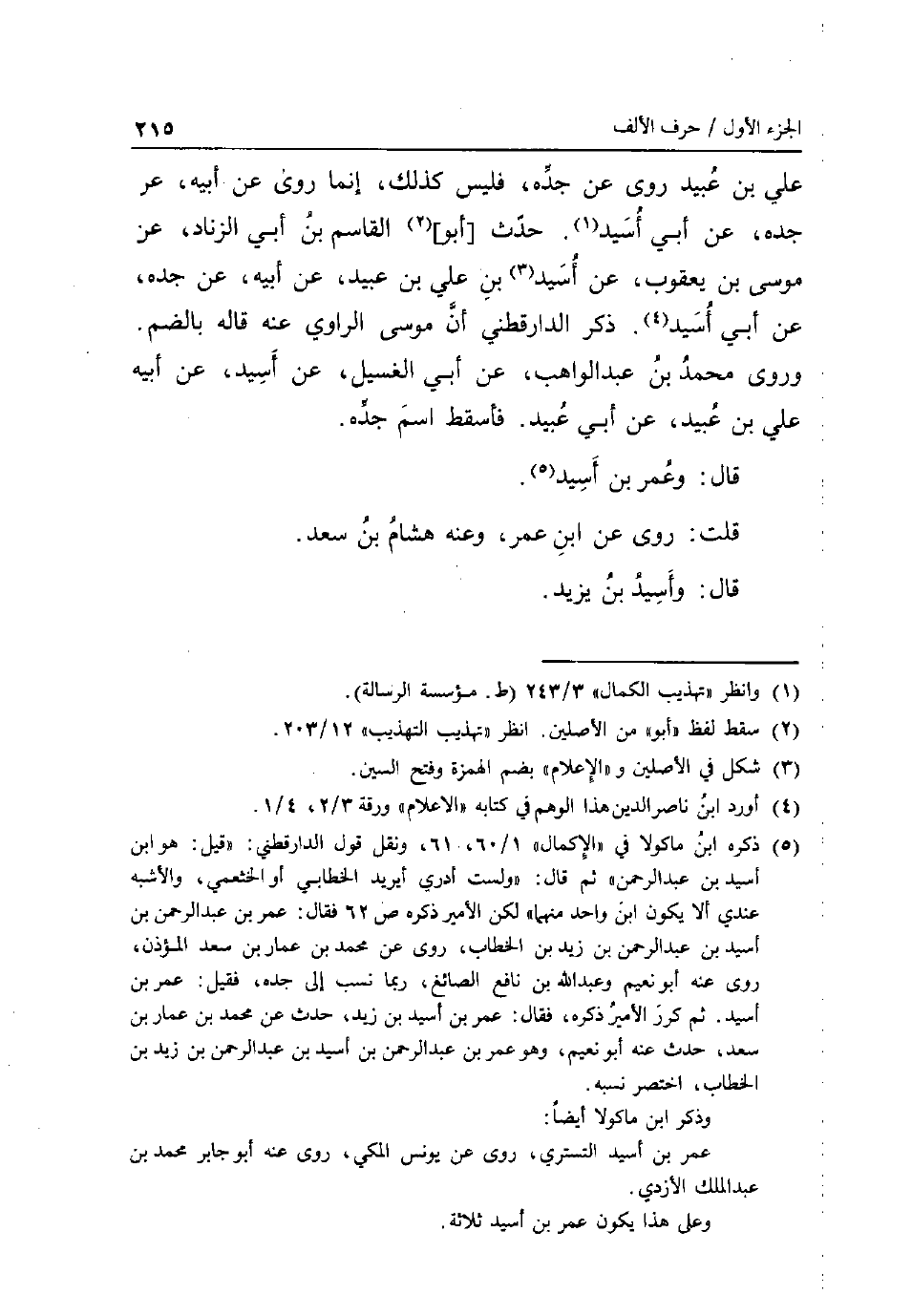 عَليّ بن عبيد روى عَن جده فَلَيْسَ كَذَلِك إِنَّمَا روى عَن ابيه عَن جده عَن أبي اسيد. حدث [أَبُو] الْقَاسِم بن أبي الزِّنَاد عَن مُوسَى بن يَعْقُوب عَن اسيد بن عَليّ بن عبيد عَن أَبِيه عَن جده عَن أبي اسيد. ذكر الدَّارَقُطْنِيّ أَن مُوسَى الرَّاوِي عَنهُ قَالَه بِالضَّمِّ. وروى مُحَمَّد بن عبد الْوَاهِب عَن أبي الغسيل عَن اسيد عَن أَبِيه عَليّ بن عبيد عَن أبي عبيد. فأسقط اسْم جده. قَالَ: وَعمر بن اسيد. قلت: روى عَن ابْن عمر وَعنهُ هِشَام بن سعد. قَالَ: واسيد بن يزِيد.