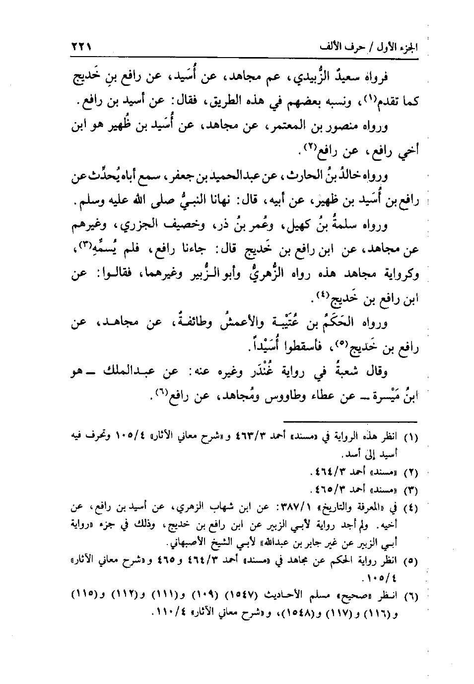 فَرَوَاهُ سعيد الزبيدِيّ عَم مُجَاهِد عَن اسيد عَن رَافع بن خديج كَمَا تقدم وَنسبه بَعضهم فِي هَذِه الطَّرِيق فَقَالَ: عَن اسيد بن رَافع. وَرَوَاهُ مَنْصُور بن الْمُعْتَمِر عَن مُجَاهِد عَن اسيد بن ظهير هُوَ ابْن أخي رَافع عَن رَافع. وَرَوَاهُ خَالِد بن الْحَارِث عَن عبد الحميد بن جَعْفَر سمع أَبَاهُ يحدث عَن رَافع بن اسيد بن ظهير عَن أَبِيه قَالَ: نَهَانَا النَّبِي صلى الله عَلَيْهِ وَسلم. وَرَوَاهُ سَلمَة بن كهيل وَعمر بن ذَر وخصيف الْجَزرِي وَغَيرهم عَن مُجَاهِد عَن ابْن رَافع بن خديج قَالَ جَاءَنَا رَافع فَلم يسمه وكرواية مُجَاهِد هَذِه رَوَاهُ الزُّهْرِيّ وَأَبُو الزبير وَغَيرهمَا فَقَالُوا: عَن ابْن رَافع بن خديج. وَرَوَاهُ الحكم بن عتيبة والاعمش وَطَائِفَة عَن مُجَاهِد عَن رَافع بن خديج فاسقطوا أسيدا. وَقَالَ شُعْبَة فِي رِوَايَة غنْدر وَغَيره عَنهُ: عَن عبد الْملك - هُوَ ابْن ميسرَة - عَن عَطاء وطاووس وَمُجاهد عَن رَافع.