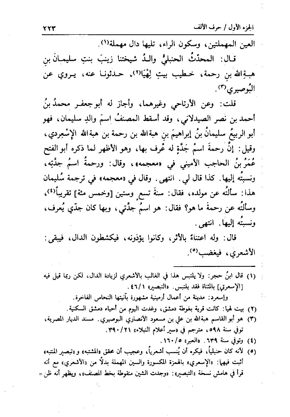 الْعين الْمُهْمَلَتَيْنِ وَسُكُون الرَّاء تَلِيهَا دَال مُهْملَة. قَالَ: الْمُحدث الْحَنْبَلِيّ وَالِد شيختنا زَيْنَب بنت سُلَيْمَان بن هبة الله بن رَحْمَة خطيب بَيت لهيا حدثونا عَنهُ يروي عَن البوصيري. قلت: وَعَن الارتاحي وَغَيرهمَا وَأَجَازَ لَهُ أَبُو جَعْفَر مُحَمَّد بن أَحْمد بن نصر الصيدلاني وَقد اسقط المُصَنّف اسْم وَالِد سُلَيْمَان فَهُوَ أَبُو الرّبيع سُلَيْمَان بن إِبْرَاهِيم بن هبة الله بن رَحْمَة بن هبة الله الاسعردي وَقيل: أَن رَحْمَة اسْم جدة لَهُ عرف بهَا وَهُوَ الاظهر لما ذكره أَبُو الْفَتْح عمر بن الْحَاجِب الاميني فِي مُعْجمَة وَقَالَ: وَرَحْمَة اسْم جدته ونسبته إِلَيْهَا. كَذَا قَالَ لي. انْتهى. وَقَالَ فِي مُعْجمَة فِي تَرْجَمَة سُلَيْمَان هَذَا: سَأَلته عَن مولده فَقَالَ: سنة تسع وَسِتِّينَ [وَخمْس مئة] تَقْرِيبًا وَسَأَلته عَن رَحْمَة مَا هُوَ؟ فَقَالَ: هُوَ اسْم جدتي وَبهَا كَانَ جدي يعرف ونسبته إِلَيْهَا. انْتهى. قَالَ: وَله اعتناء بالأثر وَكَانُوا يؤذونه فيكشطون الدَّال فَيبقى: الاشعري فيغضب.