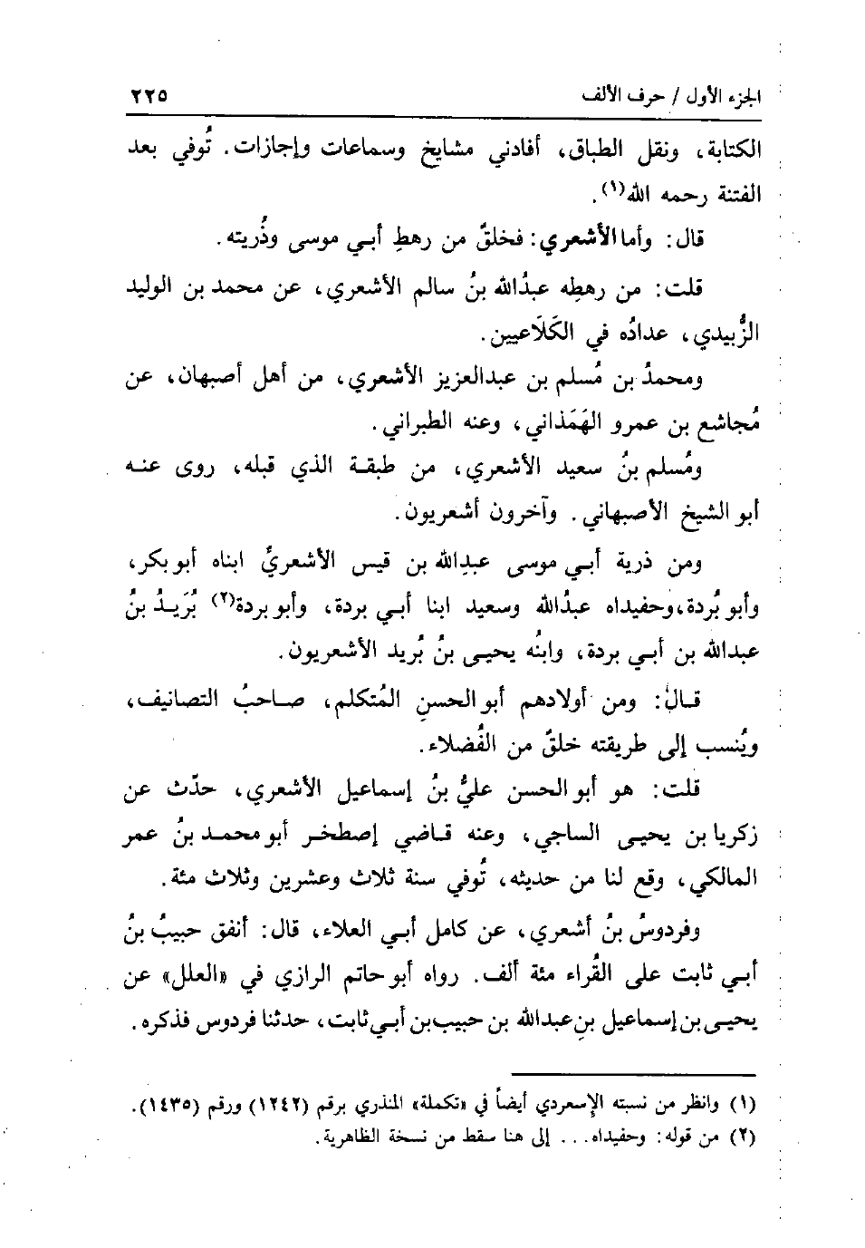 الْكِتَابَة وَنقل الطباق أفادني مَشَايِخ وسماعات وإجازات. توفّي بعد الْفِتْنَة رَحمَه الله. قَالَ: وَأما الاشعري: فخلق من رَهْط أبي مُوسَى وَذريته. قلت: من رهطه عبد الله بن سَالم الاشعري عَن مُحَمَّد بن الْوَلِيد الزبيدِيّ عداده فِي الكلاعيين. وَمُحَمّد بن مُسلم بن عبد الْعَزِيز الاشعري من أهل أَصْبَهَان عَن مجاشع بن عَمْرو الهمذاني وَعنهُ الطَّبَرَانِيّ. وَمُسلم بن سعيد الاشعري من طبقَة الَّذِي قبله روى عَنهُ أَبُو الشَّيْخ الاصبهاني. وَآخَرُونَ اشعريون. وَمن ذُرِّيَّة أبي مُوسَى عبد الله بن قيس الاشعري ابناه أَبُو بكر وَأَبُو بردة وحفيداه عبد الله وَسَعِيد ابْنا أبي بردة وَأَبُو بردة بريد بن عبد الله بن أبي بردة وَابْنه يحيى بن بريد الاشعريون. قَالَ: وَمن أَوْلَادهم أَبُو الْحسن الْمُتَكَلّم صَاحب التصانيف وينسب إِلَى طَرِيقَته خلق من الْفُضَلَاء. قلت: هُوَ أَبُو الْحسن عَليّ بن إِسْمَاعِيل الاشعري حدث عَن زَكَرِيَّا بن يحيى السَّاجِي وَعنهُ قَاضِي اصطخر أَبُو مُحَمَّد بن عمر الْمَالِكِي وَقع لنا من حَدِيثه توفّي سنة ثَلَاث وَعشْرين وَثَلَاث مئة. وفردوس بن اشعري عَن كَامِل أبي الْعَلَاء قَالَ: انفق حبيب بن أبي ثَابت على الْقُرَّاء مئة ألف. رَوَاهُ أَبُو حَاتِم الرَّازِيّ فِي الْعِلَل عَن يحيى بن إِسْمَاعِيل بن عبد الله بن حبيب بن أبي ثَابت حَدثنَا فردوس فَذكره.