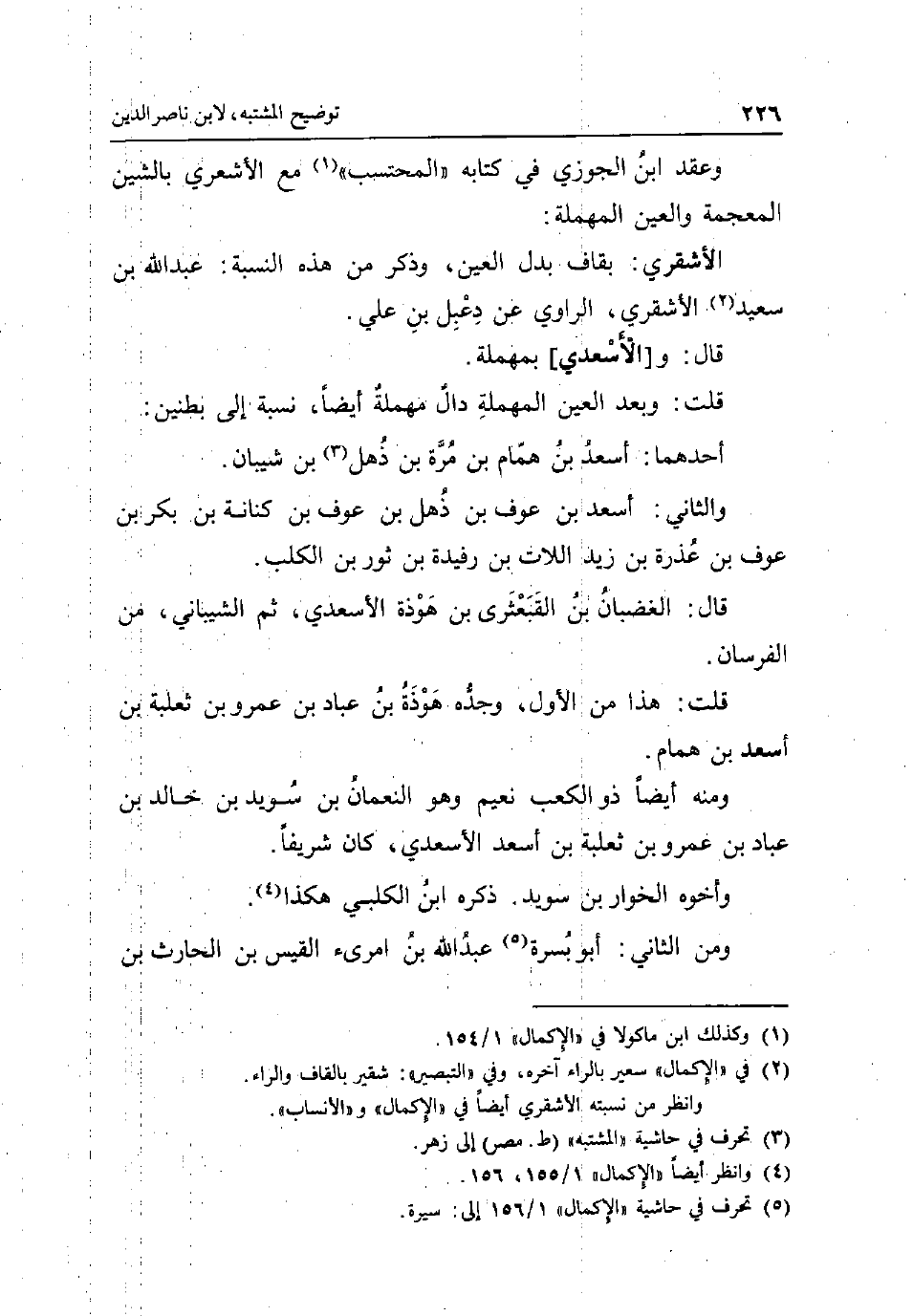 وَعقد ابْن الْجَوْزِيّ فِي كِتَابه الْمُحْتَسب مَعَ الاشعري بالشين الْمُعْجَمَة وَالْعين الْمُهْملَة: الاشقري: بقاف بدل الْعين وَذكر من هَذِه النِّسْبَة: عبد الله بن سعيد الاشقري الرَّاوِي عَن دعبل بن عَليّ. قَالَ: والأسعدي] بِمُهْملَة. قلت: وَبعد الْعين الْمُهْملَة دَال مُهْملَة ايضا نِسْبَة إِلَى بطنين: أَحدهمَا: اِسْعَدْ بن همام بن مرّة بن ذهل بن شَيبَان. وَالثَّانِي: اِسْعَدْ بن عَوْف بن ذهل بن عَوْف بن كنَانَة بن بكر بن عَوْف بن عذرة بن زيد اللات بن رفيدة بن ثَوْر بن الْكَلْب. قَالَ: الغضبان بن القبعثرى بن هَوْذَة الاسعدي ثمَّ الشَّيْبَانِيّ من الفرسان. قلت: هَذَا من الأول وجده هَوْذَة بن عباد بن عَمْرو بن ثَعْلَبَة بن اِسْعَدْ بن همام. وَمِنْه أَيْضا ذُو الكعب نعيم وَهُوَ النُّعْمَان بن سُوَيْد بن خَالِد بن عباد بن عَمْرو بن ثَعْلَبَة بن اِسْعَدْ الاسعدي كَانَ شريفا. وَأَخُوهُ الخوار بن سُوَيْد. ذكره ابْن الْكَلْبِيّ هَكَذَا. وَمن الثَّانِي: أَبُو بسرة عبد الله بن امْرِئ الْقَيْس بن الْحَارِث بن