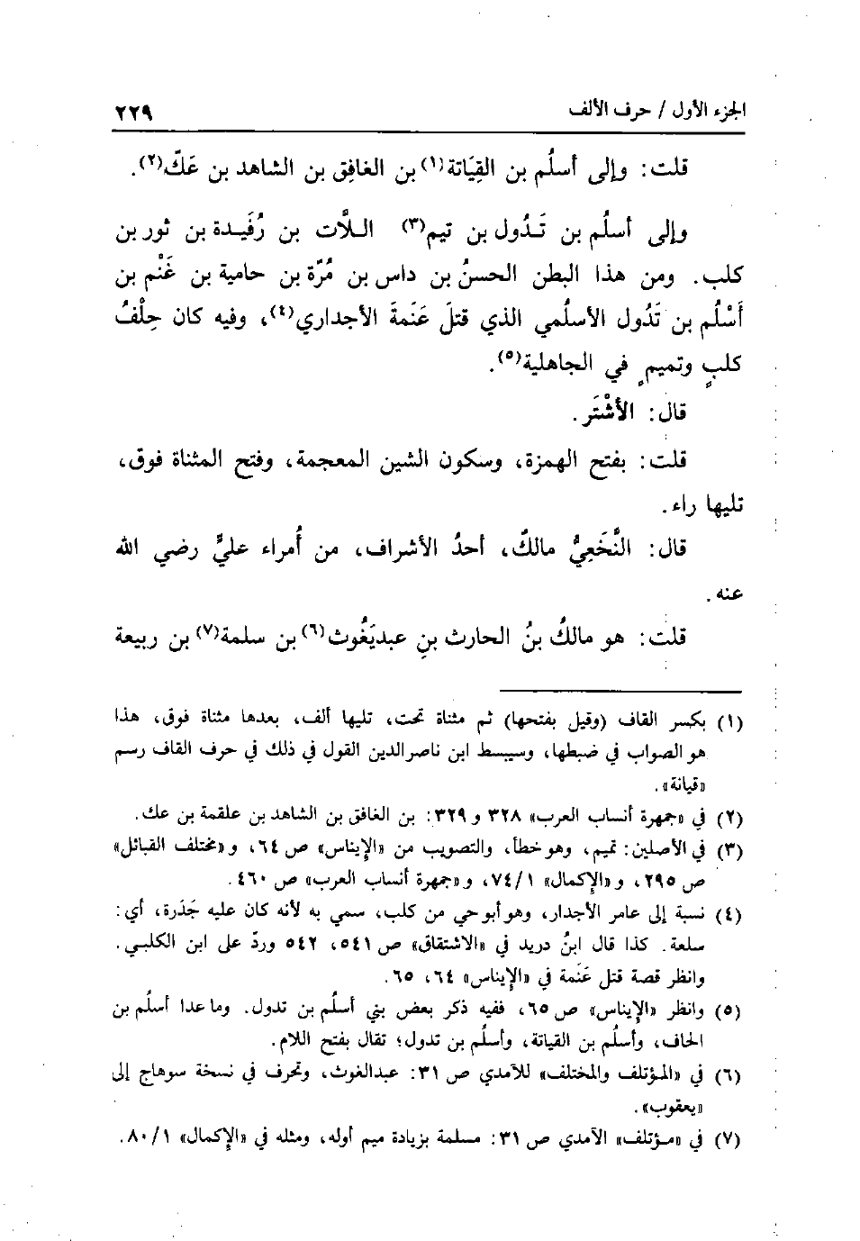قلت: وَإِلَى اسْلَمْ بن القياتة بن الغافق بن الشَّاهِد بن عك. وَإِلَى اسْلَمْ بن تدول بن تيم اللات بن رفيدة بن ثَوْر بن كلب. وَمن هَذَا الْبَطن الْحسن بن داس بن مرّة بن حامية بن غنم بن اسْلَمْ بن تدول الاسلمي الَّذِي قتل عنمة الاجداري وَفِيه كَانَ حلف كلب وَتَمِيم فِي الْجَاهِلِيَّة. قَالَ: الاشتر. قلت: بِفَتْح الْهمزَة وَسُكُون الشين الْمُعْجَمَة وَفتح الْمُثَنَّاة فَوق تَلِيهَا رَاء. قَالَ: النَّخعِيّ مَالك أحد الاشراف من أُمَرَاء عَليّ رَضِي الله قلت: هُوَ مَالك بن الْحَارِث بن عبديغوث بن سَلمَة بن ربيعَة