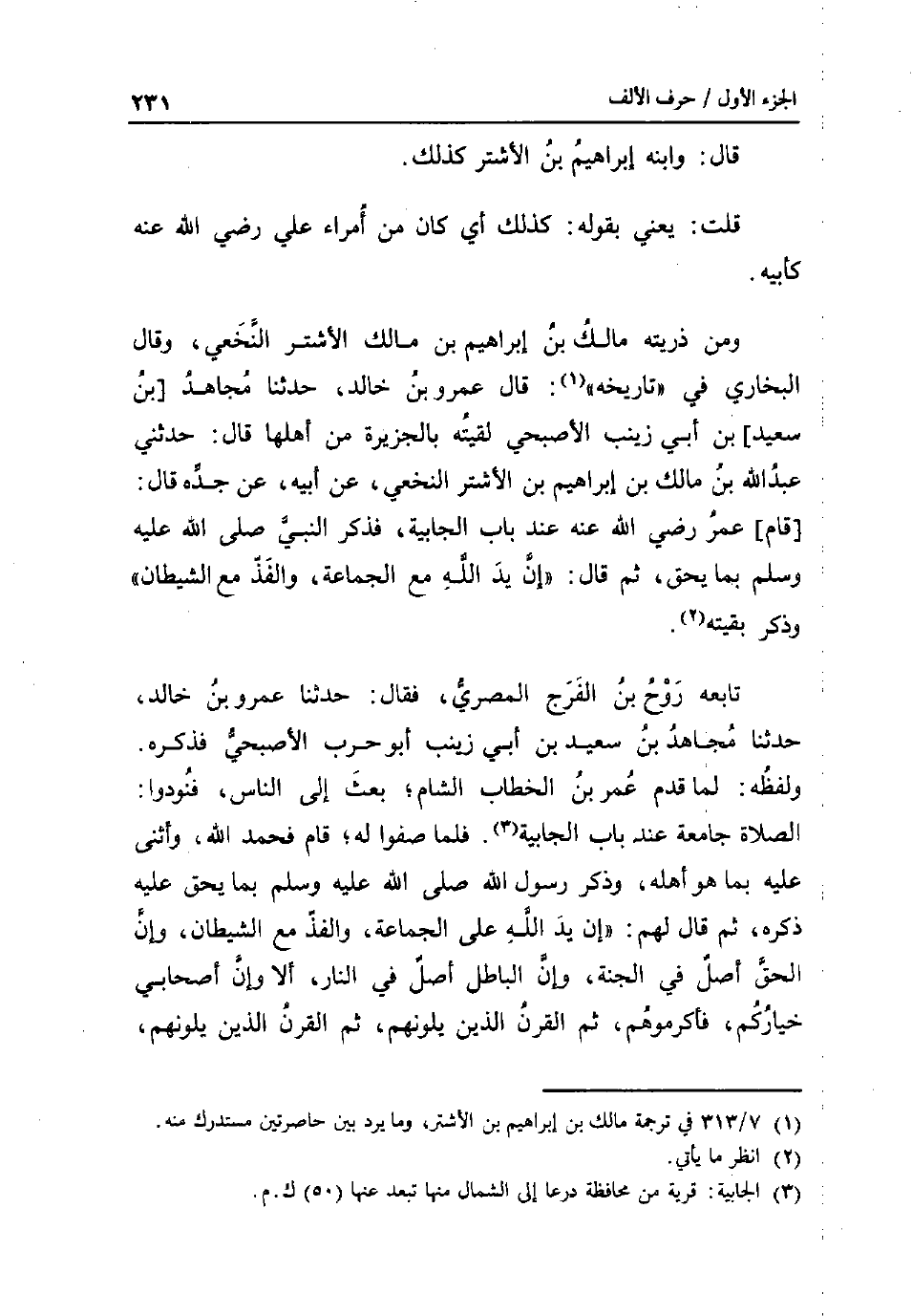 قَالَ: وَابْنه إِبْرَاهِيم بن الاشتر كَذَلِك. قلت: يَعْنِي بقوله: كَذَلِك أَي كَانَ من أُمَرَاء عَليّ رَضِي الله عَنهُ كأبيه. وَمن ذُريَّته مَالك بن إِبْرَاهِيم بن مَالك الاشتر النَّخعِيّ وَقَالَ البُخَارِيّ فِي تَارِيخه: قَالَ عَمْرو بن خَالِد حَدثنَا مُجَاهِد [بن سعيد] بن أبي زَيْنَب الاصبحي لَقيته بالجزيرة من أَهلهَا قَالَ: حَدثنِي عبد الله بن مَالك بن إِبْرَاهِيم بن الاشتر النَّخعِيّ عَن ابيه عَن جده قَالَ: [قَامَ] عمر رَضِي الله عَنهُ عِنْد بَاب الْجَابِيَة فَذكر النَّبِي صلى الله عَلَيْهِ وَسلم بِمَا يحِق ثمَّ قَالَ: إِن يَد الله مَعَ الْجَمَاعَة وألفذ مَعَ الشَّيْطَان وَذكر بَقِيَّته. تَابعه روح بن الْفرج الْمصْرِيّ فَقَالَ: حَدثنَا عَمْرو بن خَالِد حَدثنَا مُجَاهِد بن سعيد بن أبي زَيْنَب أَبُو حَرْب الاصبحي فَذكره. وَلَفظه: لما قدم عمر بن الْخطاب الشَّام بعث إِلَى النَّاس فنودوا: الصَّلَاة جَامِعَة عِنْد بَاب الْجَابِيَة. فَلَمَّا صفوا لَهُ قَامَ فَحَمدَ الله وَأثْنى عَلَيْهِ بِمَا هُوَ أَهله وَذكر رَسُول الله صلى الله عَلَيْهِ وَسلم بِمَا يحِق عَلَيْهِ ذكره ثمَّ قَالَ: لَهُم: إِن يَد الله على الْجَمَاعَة والفذ مَعَ الشَّيْطَان وَإِن الْحق اصل فِي الْجنَّة وَإِن الْبَاطِل اصل فِي النَّار أَلا وان أَصْحَابِي خياركم فأكرموهم ثمَّ الْقرن الَّذين يَلُونَهُمْ ثمَّ الْقرن الَّذين يَلُونَهُمْ