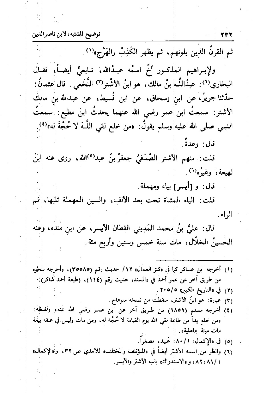 ثمَّ الْقرن الَّذين يَلُونَهُمْ ثمَّ يظْهر الْكَذِب والهرج. ولإبراهيم الْمَذْكُور اخ اسْمه عبد الله تَابِعِيّ ايضا فَقَالَ البُخَارِيّ: عبد الله بن مَالك هُوَ ابْن الاشتر النَّخعِيّ. قَالَ عُثْمَان: حَدثنَا جرير عَن ابْن إِسْحَاق عَن ابْن قسيط عَن عبد الله بن مَالك الأشتر: سَمِعت ابْن عمر رَضِي الله عَنْهُمَا يحدث ابْن مُطِيع: سَمِعت النَّبِي صلى الله عَلَيْهِ وَسلم يَقُول: من خلع لَقِي الله لَا حجَّة لَهُ. قَالَ: وعدة. قلت: مِنْهُم الاشتر الصَّدَفِي جَعْفَر بن عبد الله روى عَنهُ ابْن لَهِيعَة وَغَيره. قَالَ: و [أيسر] بياء ومهملة. قلت: الْيَاء الْمُثَنَّاة تَحت بعد الْألف وَالسِّين الْمُهْملَة تَلِيهَا ثمَّ الرَّاء. قَالَ: عَليّ بن مُحَمَّد الْمَدِينِيّ الْقطَّان الْأَيْسَر عَن ابْن مَنْدَه وَعنهُ الْحُسَيْن الْخلال مَاتَ سنة خمس وَسِتِّينَ وَأَرْبع مئة.