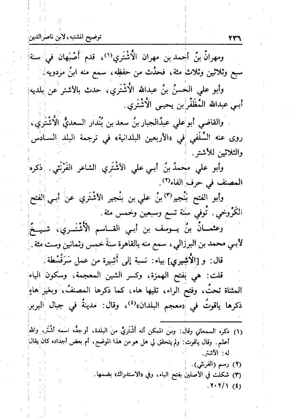 ومهران بن أَحْمد بن مهْرَان الاشتري قدم اصبهان فِي سنة سبع وَثَلَاثِينَ وَثَلَاث مئة فَحدث من حفظه سمع مِنْهُ ابْن مرْدَوَيْه. وابو عَليّ الْحسن بن عبد الله الاشتري حدث بالاشتر عَن بلدية أبي عبد الله المظفر بن يحيى الاشتري. وَالْقَاضِي أَبُو عَليّ عبد الْجَبَّار بن سعد بن بنْدَار السَّعْدِيّ الاشتري روى عَنهُ السلَفِي فِي الْأَرْبَعين البلدانية فِي تَرْجَمَة الْبَلَد السَّادِس وَالثَّلَاثِينَ للأشتر. وَأَبُو عَليّ مُحَمَّد بن أبي عَليّ الاشتري الشَّاعِر الفرنثي. ذكره المُصَنّف فِي حرف الْفَاء. وَأَبُو الْفَتْح بنجير بن عَليّ بن بنجير الاشتري عَن أبي الْفَتْح الكروخي. توفّي سنة تسع وَسبعين وَخمْس مئة. وَعُثْمَان بن يُوسُف بن أبي الْقَاسِم الاشتري شيخ لأبي مُحَمَّد بن البرزالي سمع مِنْهُ بِالْقَاهِرَةِ سنة خمس وَثَمَانِينَ وست مئة. قَالَ: و [الاشيري] بياء: نِسْبَة إِلَى أشيرة من عمل سرقسطة. قلت: هِيَ بِفَتْح الْهمزَة وَكسر الشين الْمُعْجَمَة وَسُكُون الْيَاء الْمُثَنَّاة تَحت وَفتح الرَّاء تَلِيهَا هَاء كَمَا ذكرهَا المُصَنّف وَبِغير هَاء ذكرهَا ياقوت فِي مُعْجم الْبلدَانِ وَقَالَ: مَدِينَة فِي جبال البربر